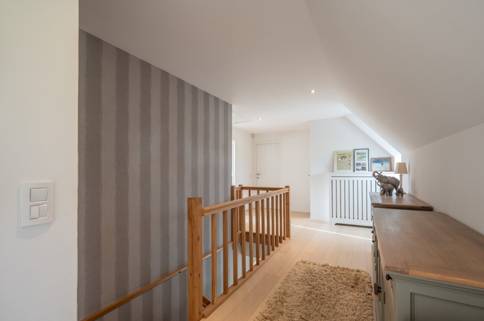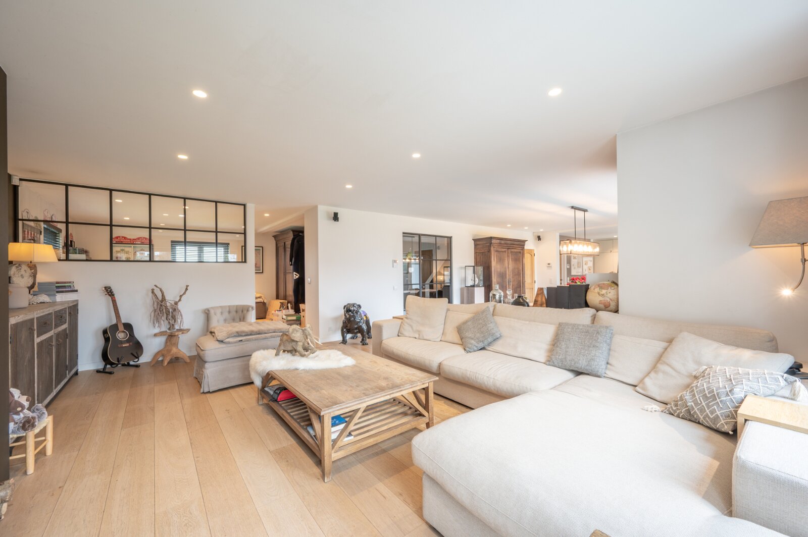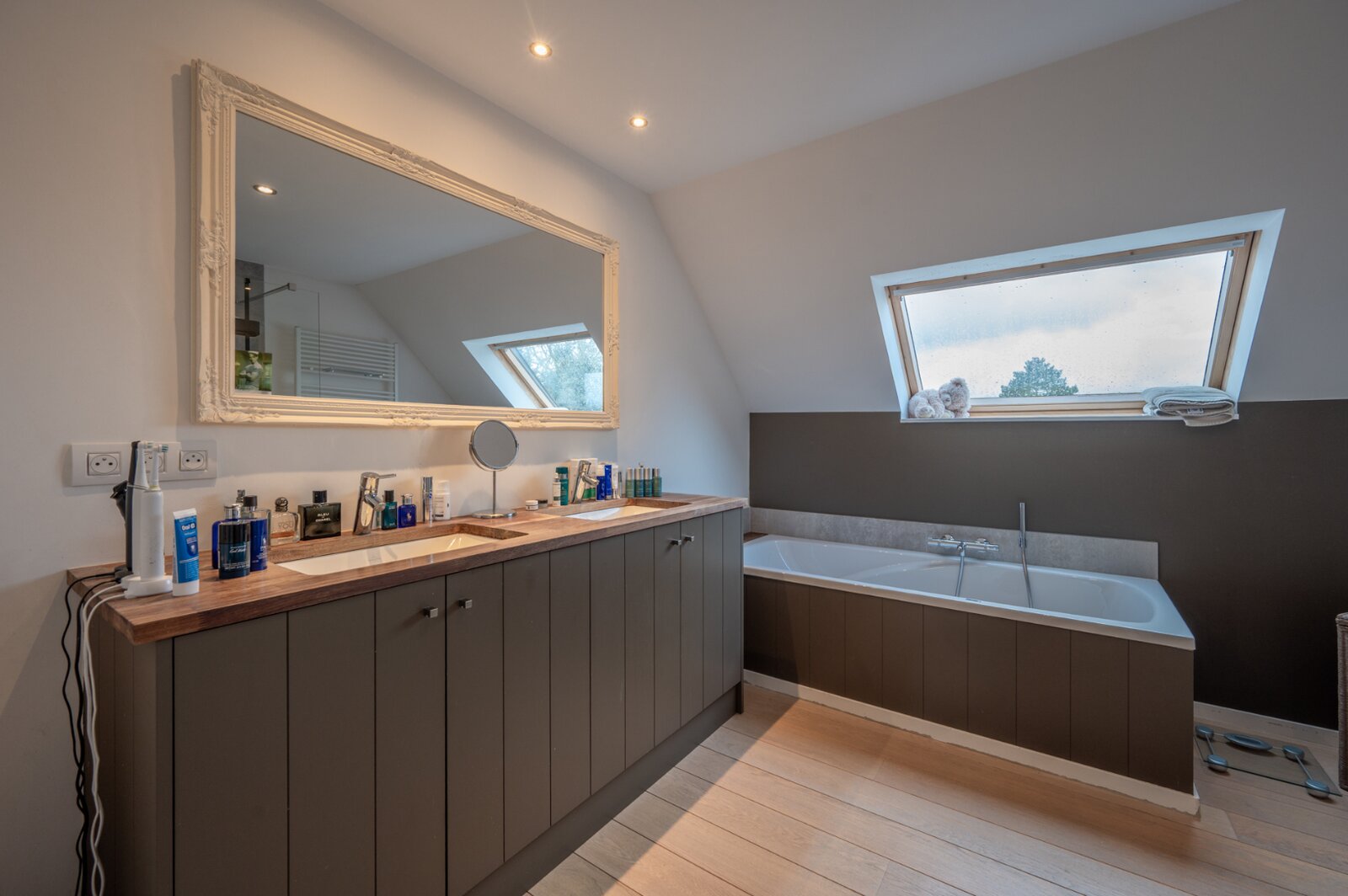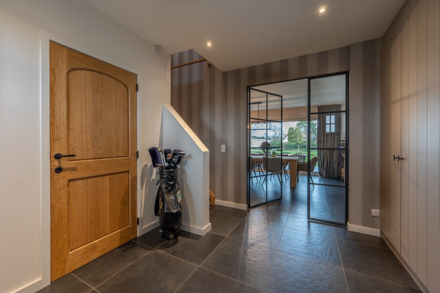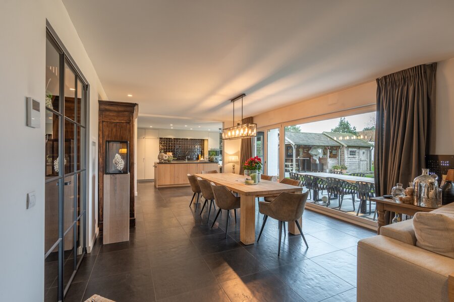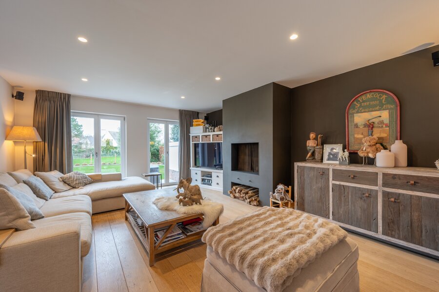 Bij het betreden van de villa komt u binnen in een ruime inkomhal met vestiaire en gastentoilet. De gezellige leefruimte met haard vormt het hart van de woning en sluit naadloos aan op de volledig ingerichte open keuken en de ruime eetplaats. Dankzij de grote raampartijen genieten de leefruimte, zitruimte en keuken van een overvloed aan natuurlijk licht en directe toegang tot het zonnige terras en de perfect georiënteerde tuin. Aansluitend aan de leefruimte bevindt zich een ruime open bureauruimte, ideaal voor thuiswerk of een rustige leeshoek.