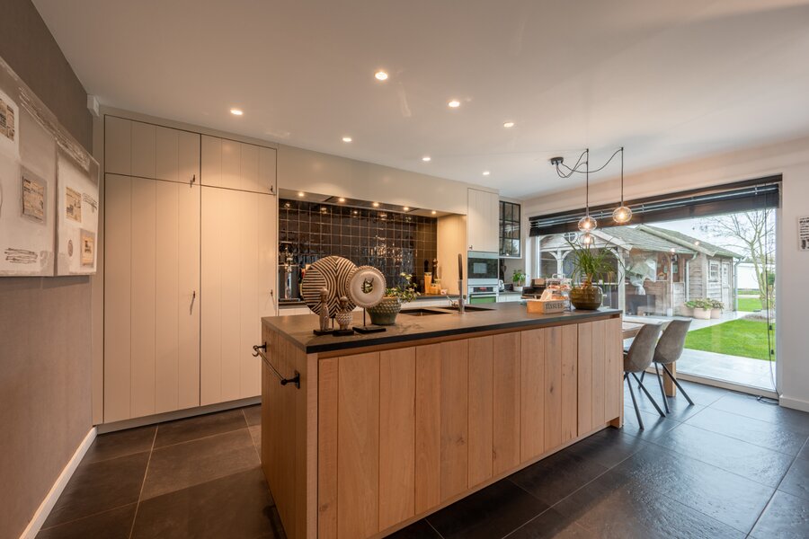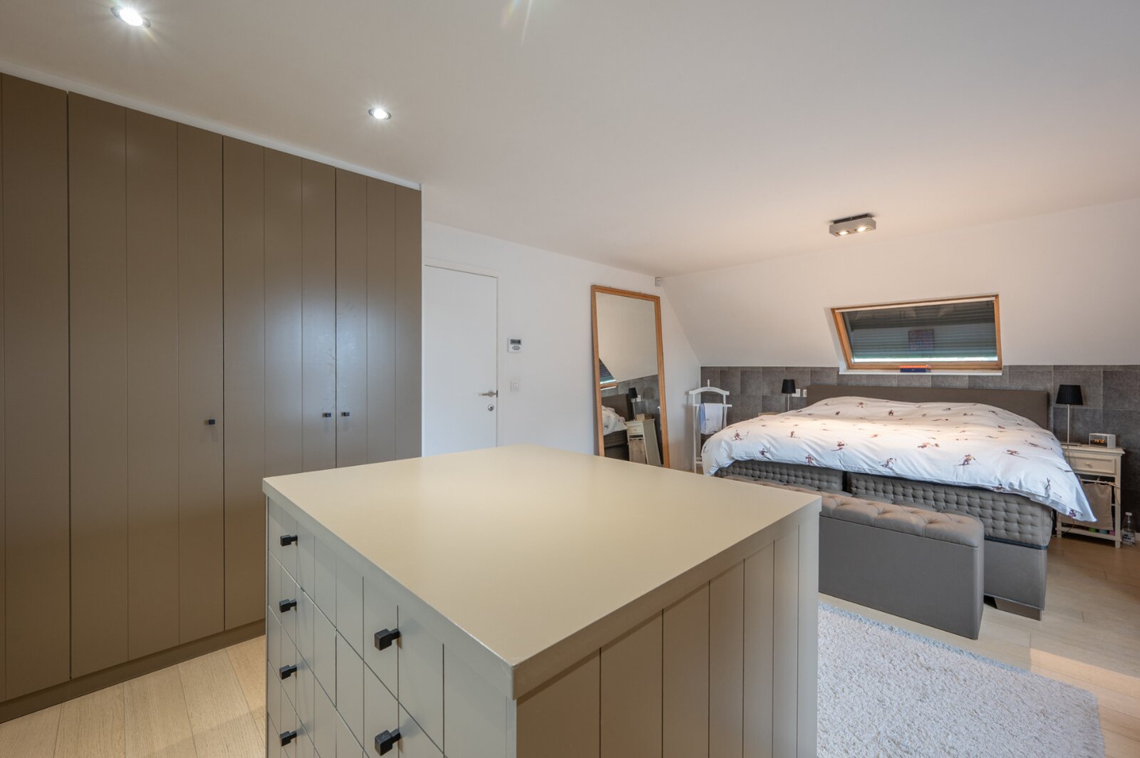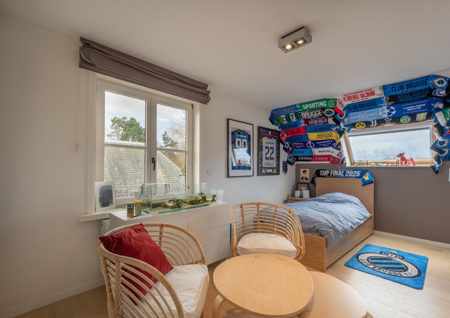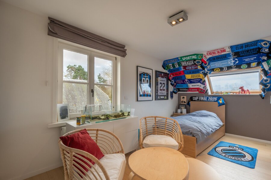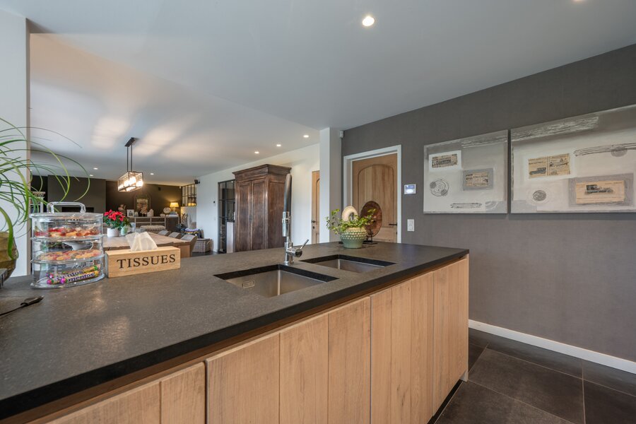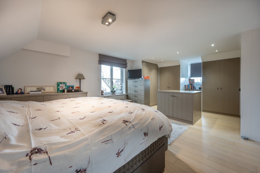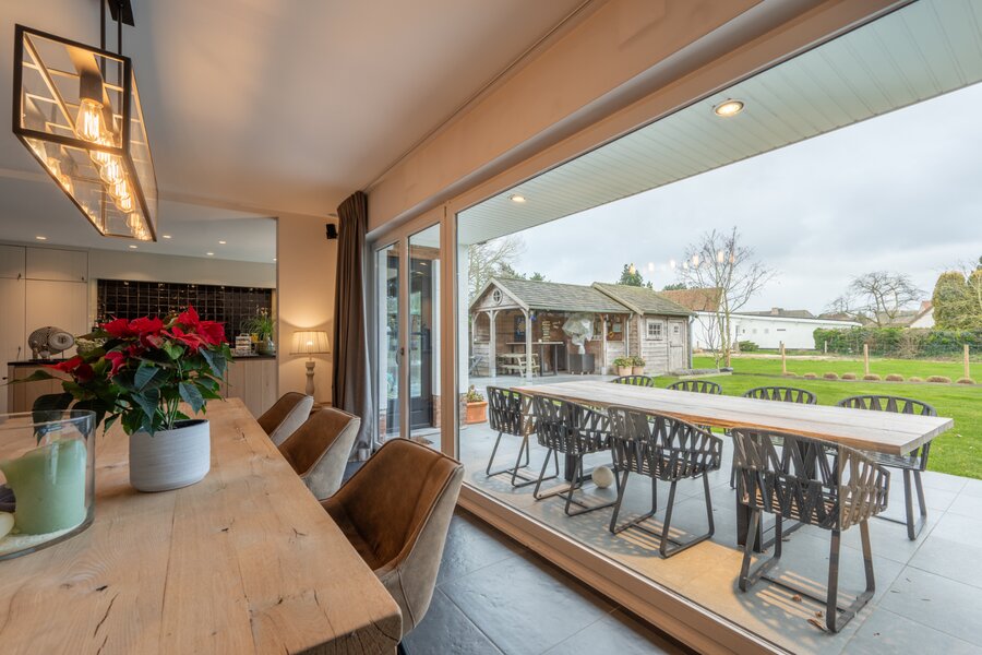 Bij het betreden van de villa komt u binnen in een ruime inkomhal met vestiaire en gastentoilet. De gezellige leefruimte met haard vormt het hart van de woning en sluit naadloos aan op de volledig ingerichte open keuken en de ruime eetplaats. Dankzij de grote raampartijen genieten de leefruimte, zitruimte en keuken van een overvloed aan natuurlijk licht en directe toegang tot het zonnige terras en de perfect georiënteerde tuin. Aansluitend aan de leefruimte bevindt zich een ruime open bureauruimte, ideaal voor thuiswerk of een rustige leeshoek.