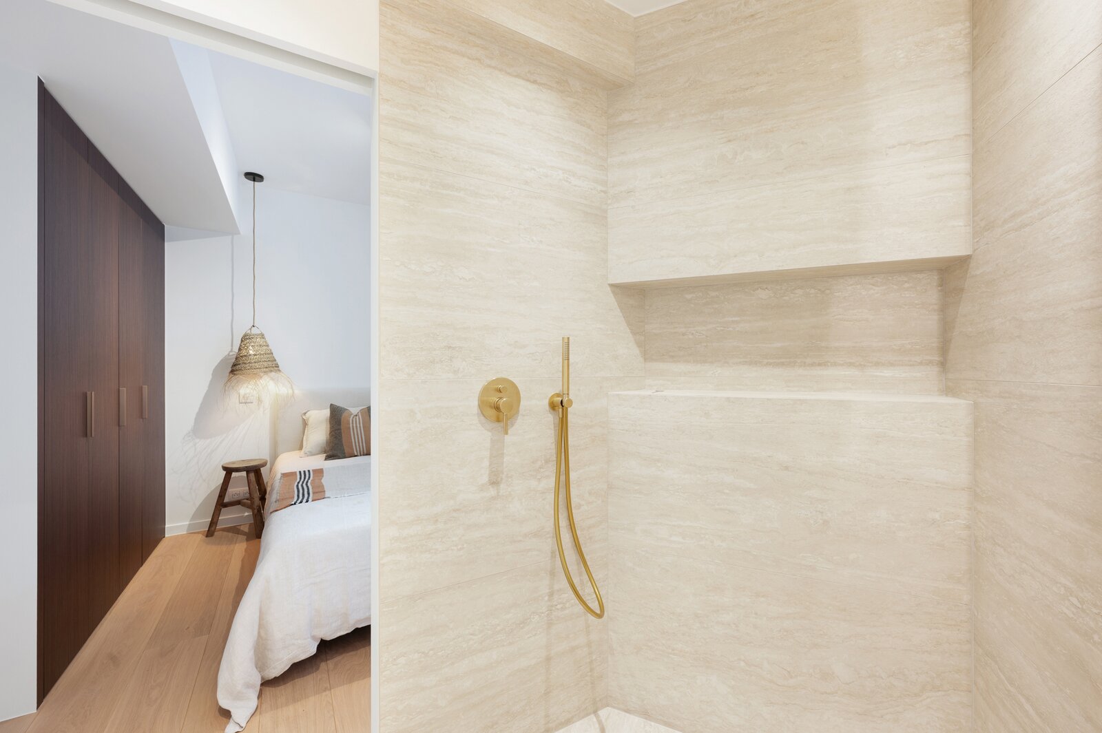 Een stijlvol en warm appartement, uitgevoerd in zachte zandtinten en duurzame materialen, op een steenworp van de Zeedijk van het Zoute.