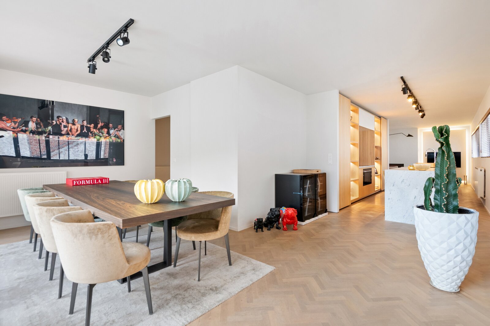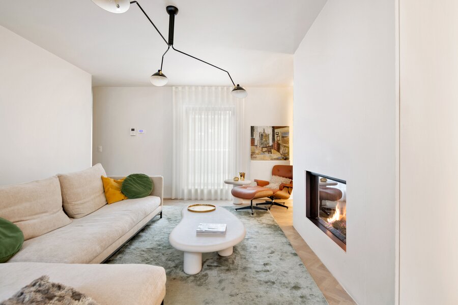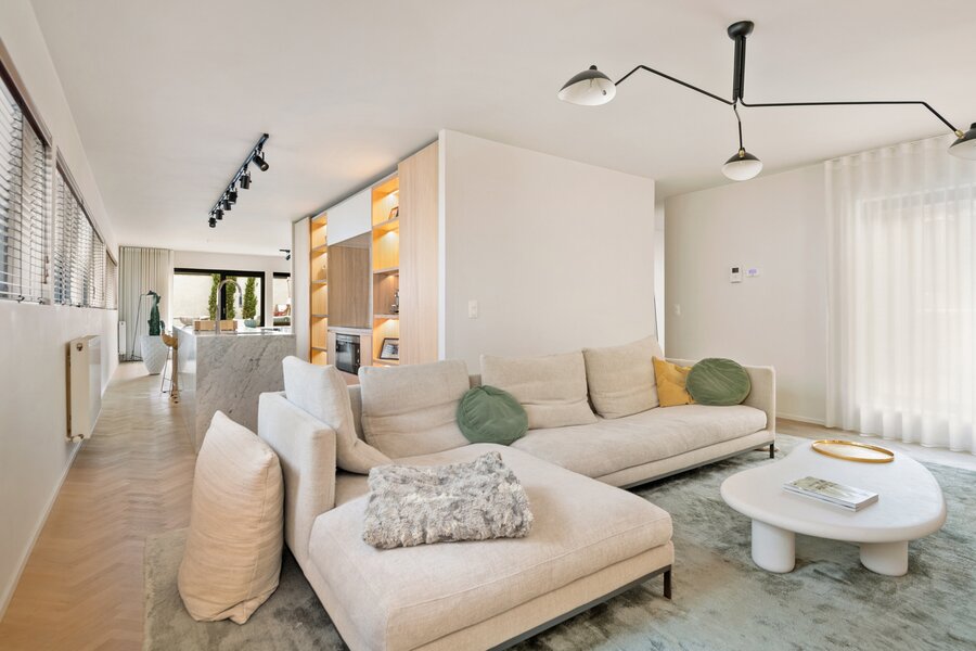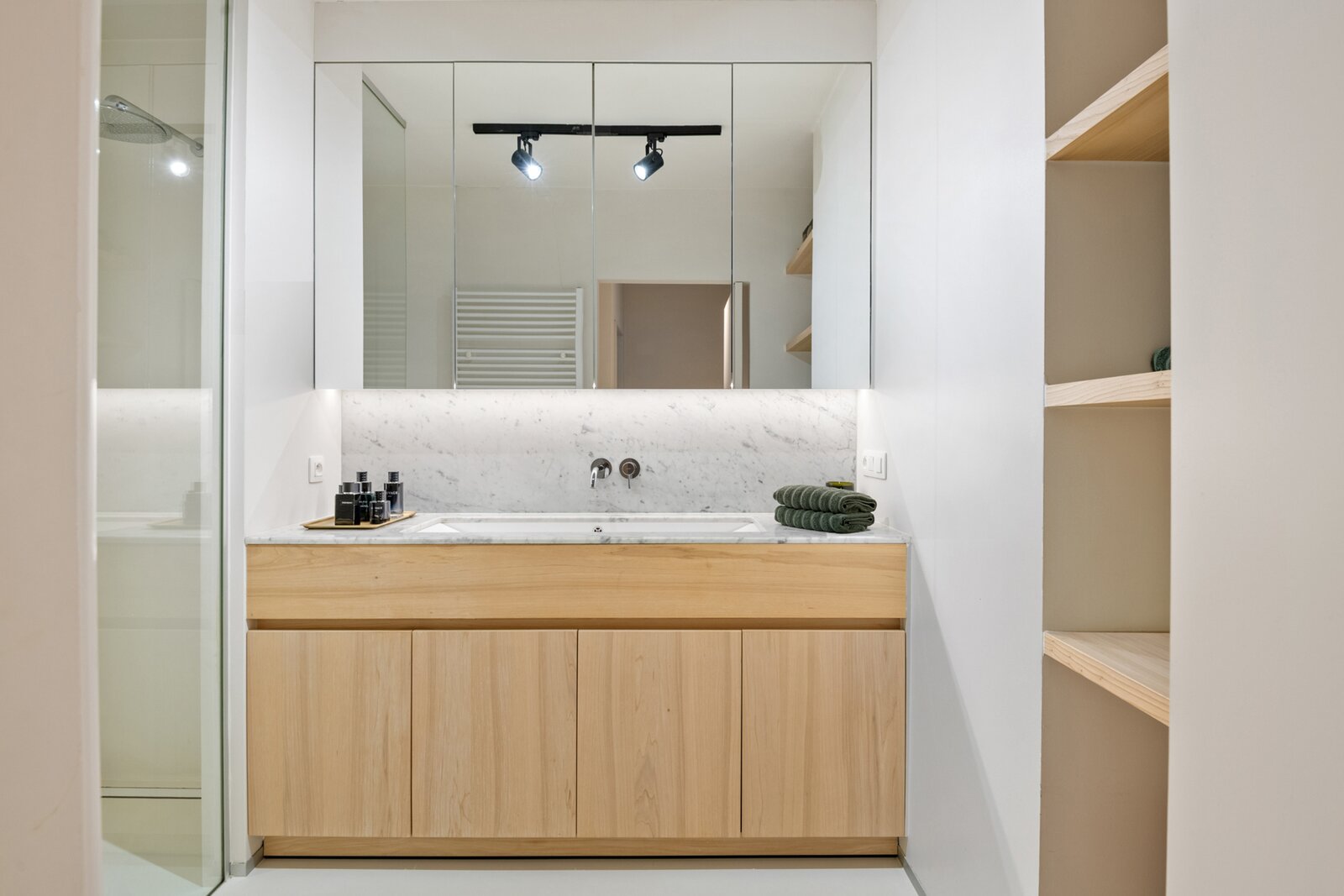 De ruime leef- en eetkamer, die subtiel van elkaar gescheiden zijn, creëren een gevoel van balans en harmonie. Tussen beide ruimtes bevindt zich de maatwerkkeuken van Sebastiaan, het centrale hart van de woning waar koken, samenkomen en genieten naadloos in elkaar overvloeien. De circulatie rond het middenblok zorgt voor een natuurlijke flow doorheen het appartement, waardoor elke ruimte logisch geordend en vlot toegankelijk aanvoelt. De badkamer, eveneens ontworpen door Sebastiaan, straalt pure verfijning uit dankzij de naadloze gietvloer en zorgvuldig geselecteerde materialen. Verder beschikt het appartement over twee volwaardige slaapkamers, elk met aangename lichtinval en een gevoel van rust, ideaal voor vaste bewoning, logeerruimte of home office.