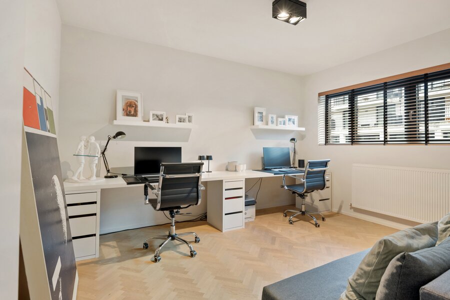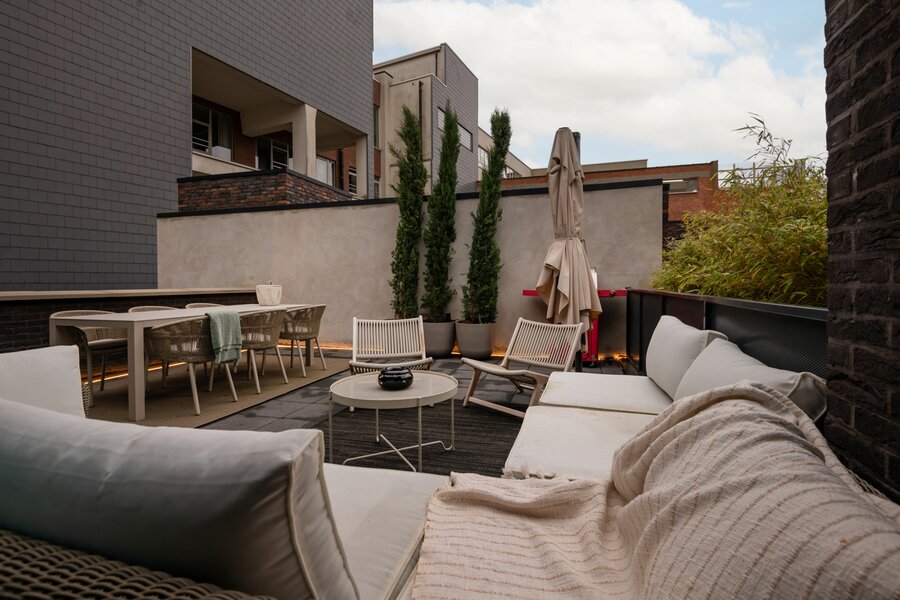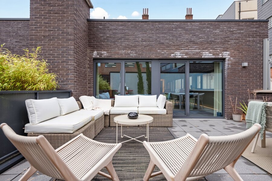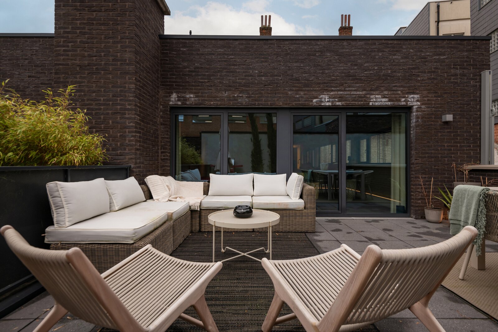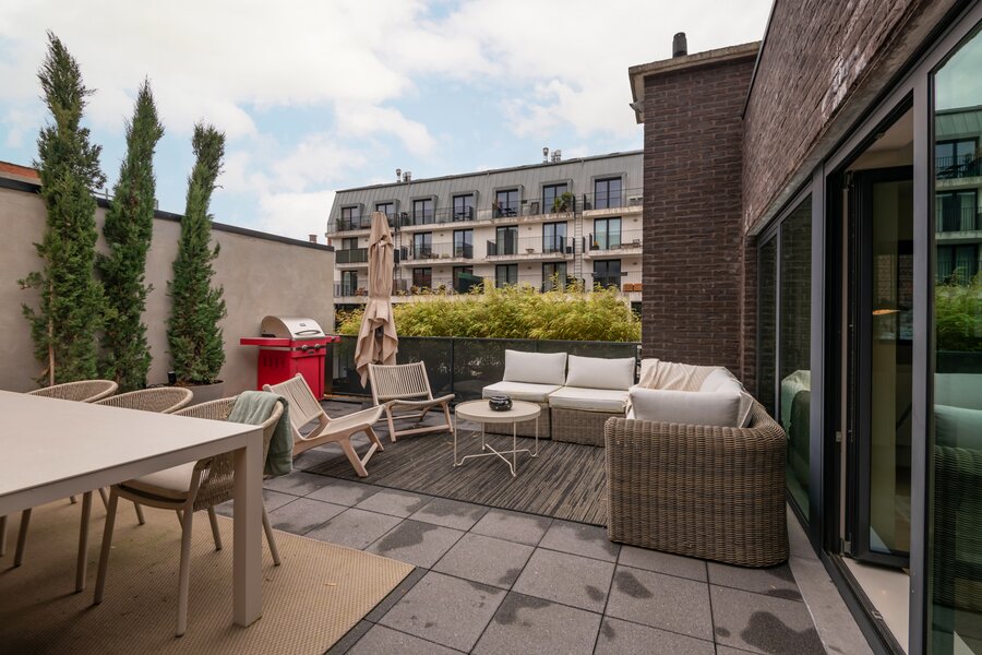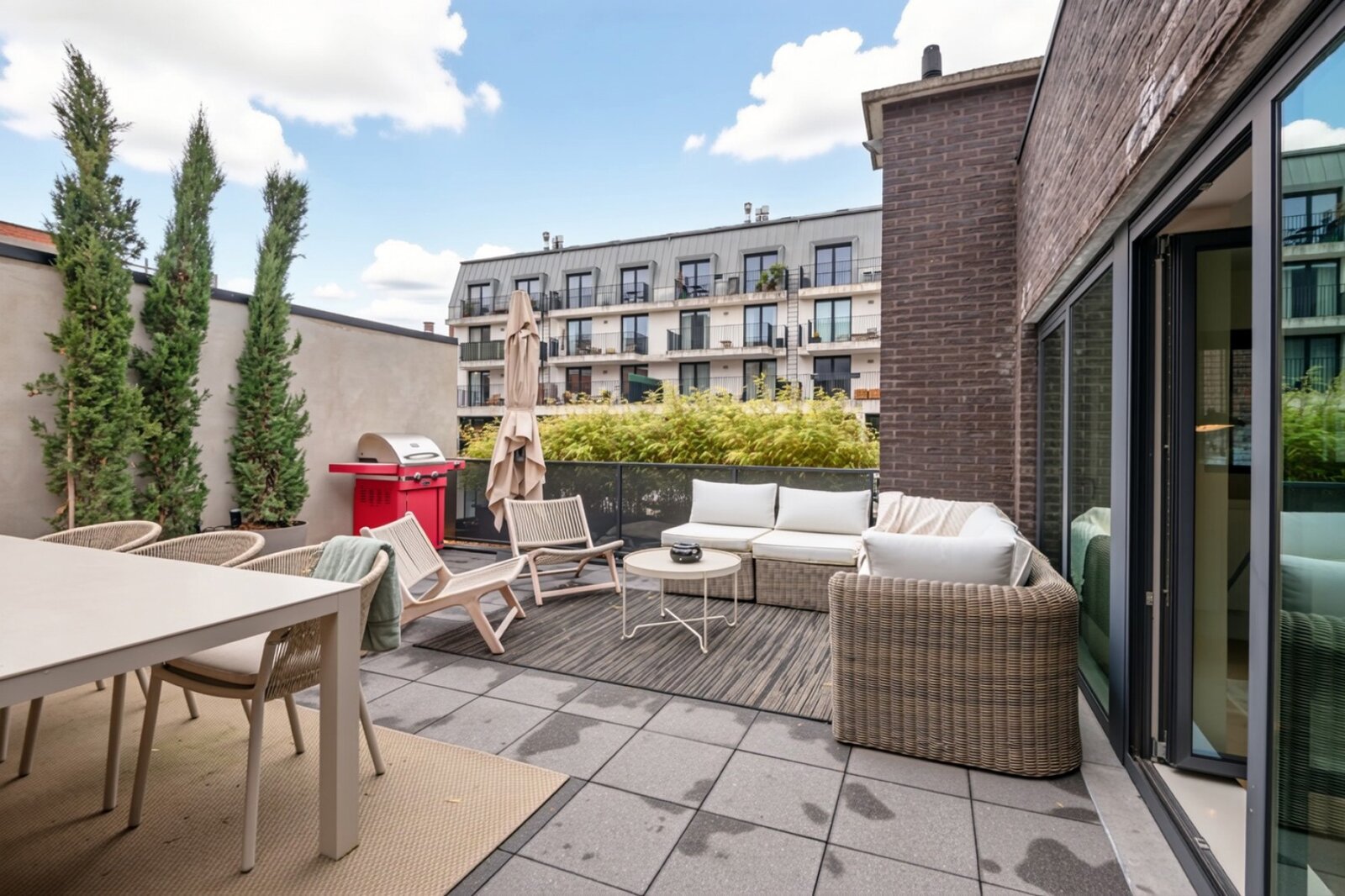 Dankzij de ligging op de bovenste en enige verdieping geniet u van overvloedig daglicht en een open, luchtige sfeer. Aan de voorzijde bevindt zich een zonnig terras van 20 m², terwijl het ruime achterterras van 30 m² uitnodigt tot lange zomeravonden in alle stilte, een zeldzame luxe in het hart van de stad. Daarnaast is er toegang tot een gedeelde tuin, een groene gemeenschappelijke plek waar bewoners kunnen ontspannen en genieten van de buitenlucht in alle rust.
