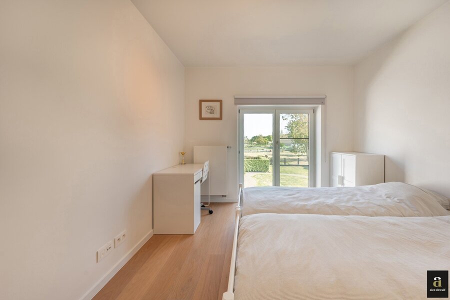Indeling: Gelijkvloers: inkomhal met vestiaire en gastentoilet, ruime en lichte woonkamer met hoge plafonds, open keuken met eetruimte die uitgeeft op de zonnige tuin en het terras. Praktische bijkeuken/wasplaats. Bureel of gastenkamer met uitzicht op tuin en velden, eveneens met toegang tot een terras.
