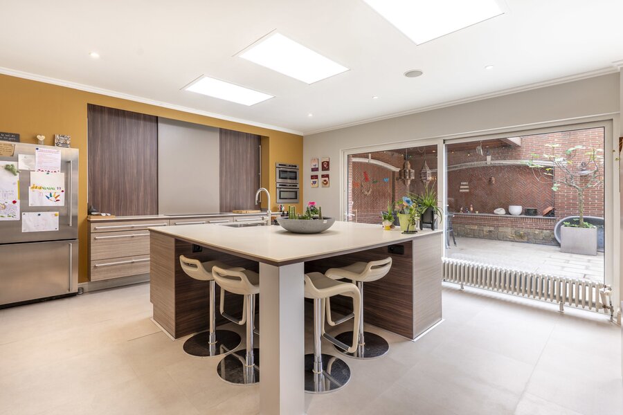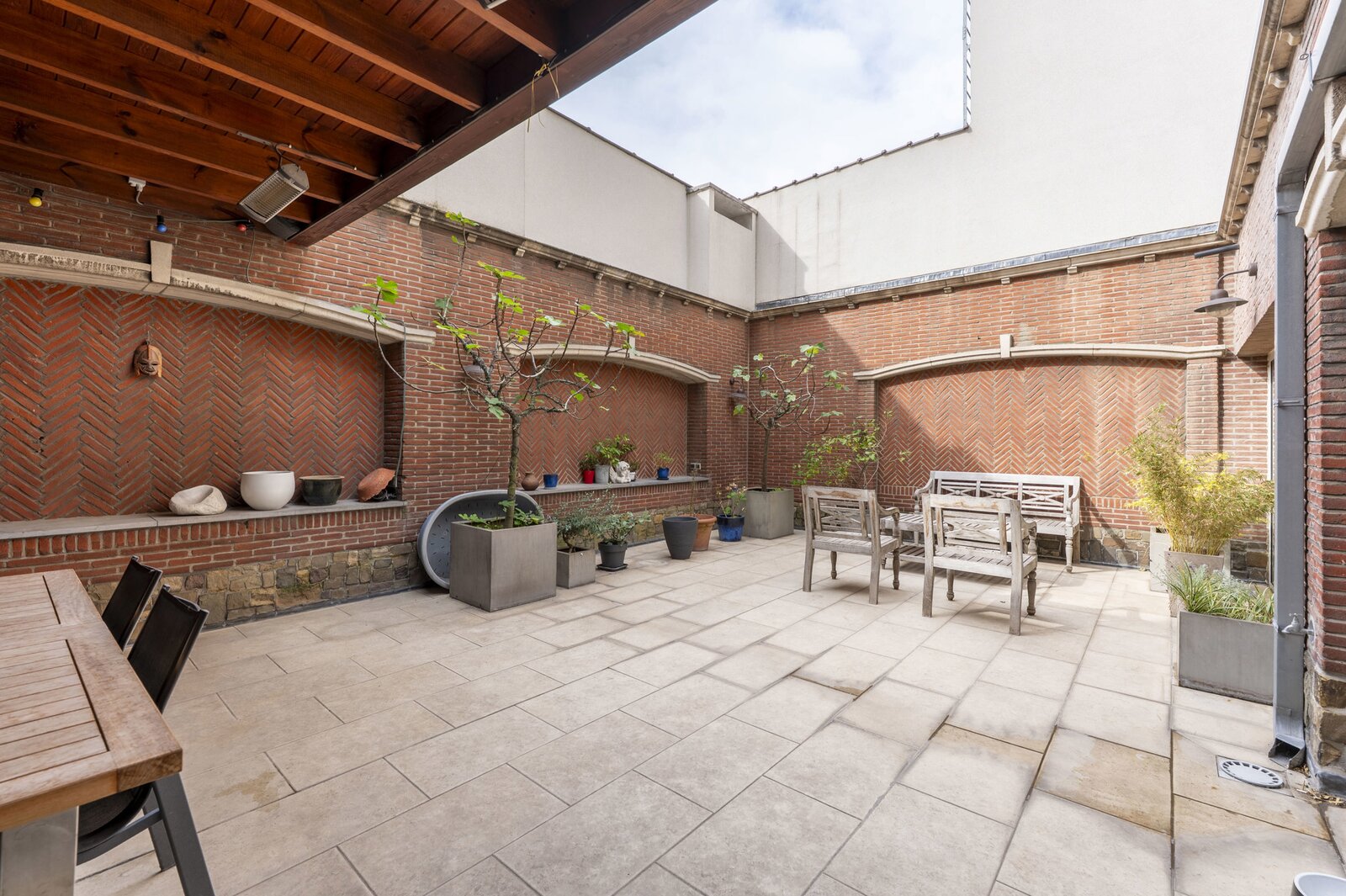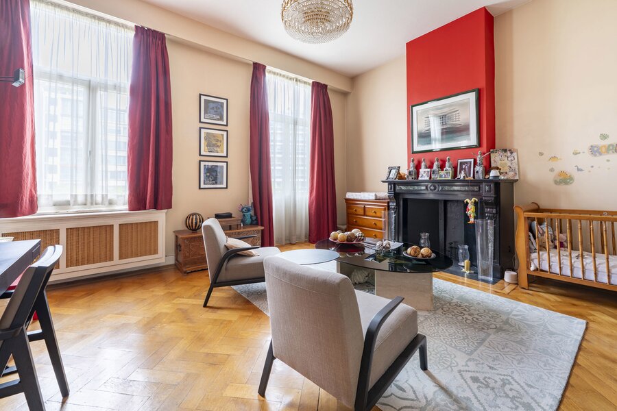 De eerste verdieping vormt het hart van de woning, met een lichtrijke leefruimte en eetkamer die naadloos overgaat in een volledig uitgeruste keuken. Grote ramen zorgen voor overvloedig daglicht en bieden toegang tot een ruim en zonnig terras, een zeldzaam buitenverblijf midden in de stad waar het heerlijk vertoeven is.