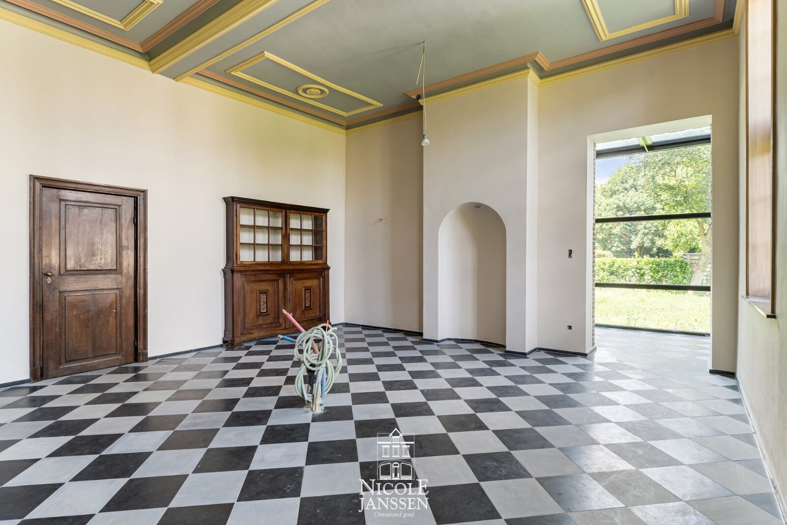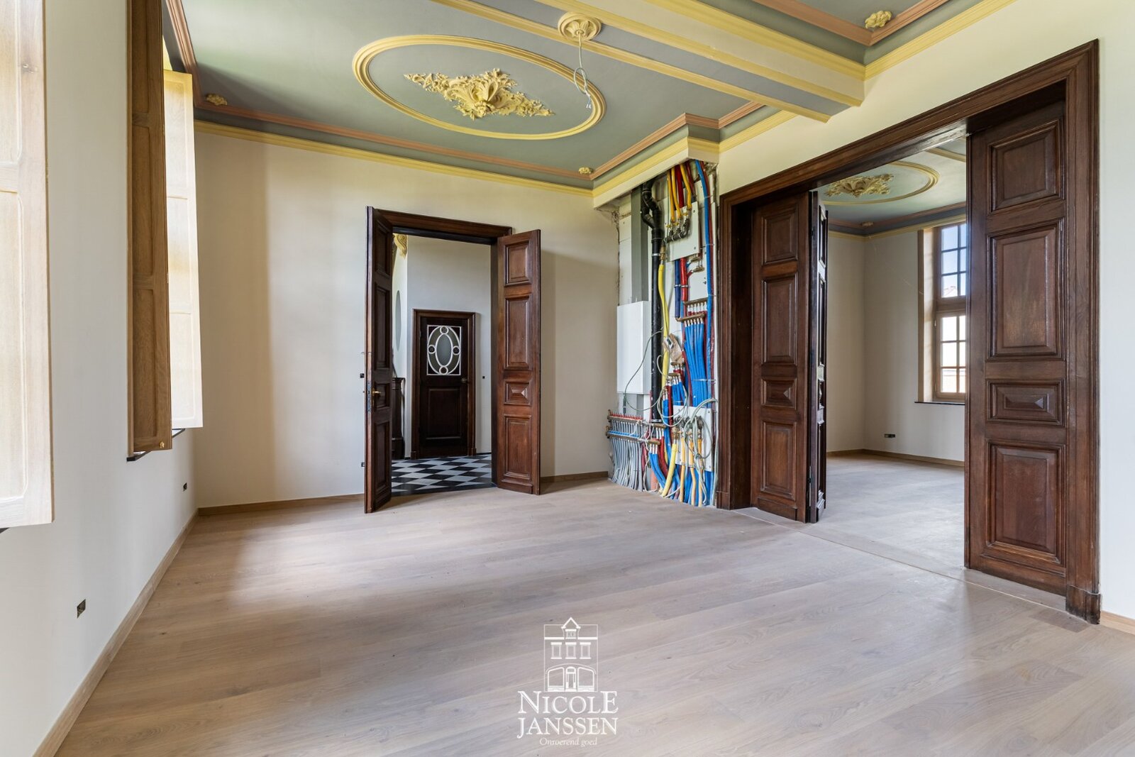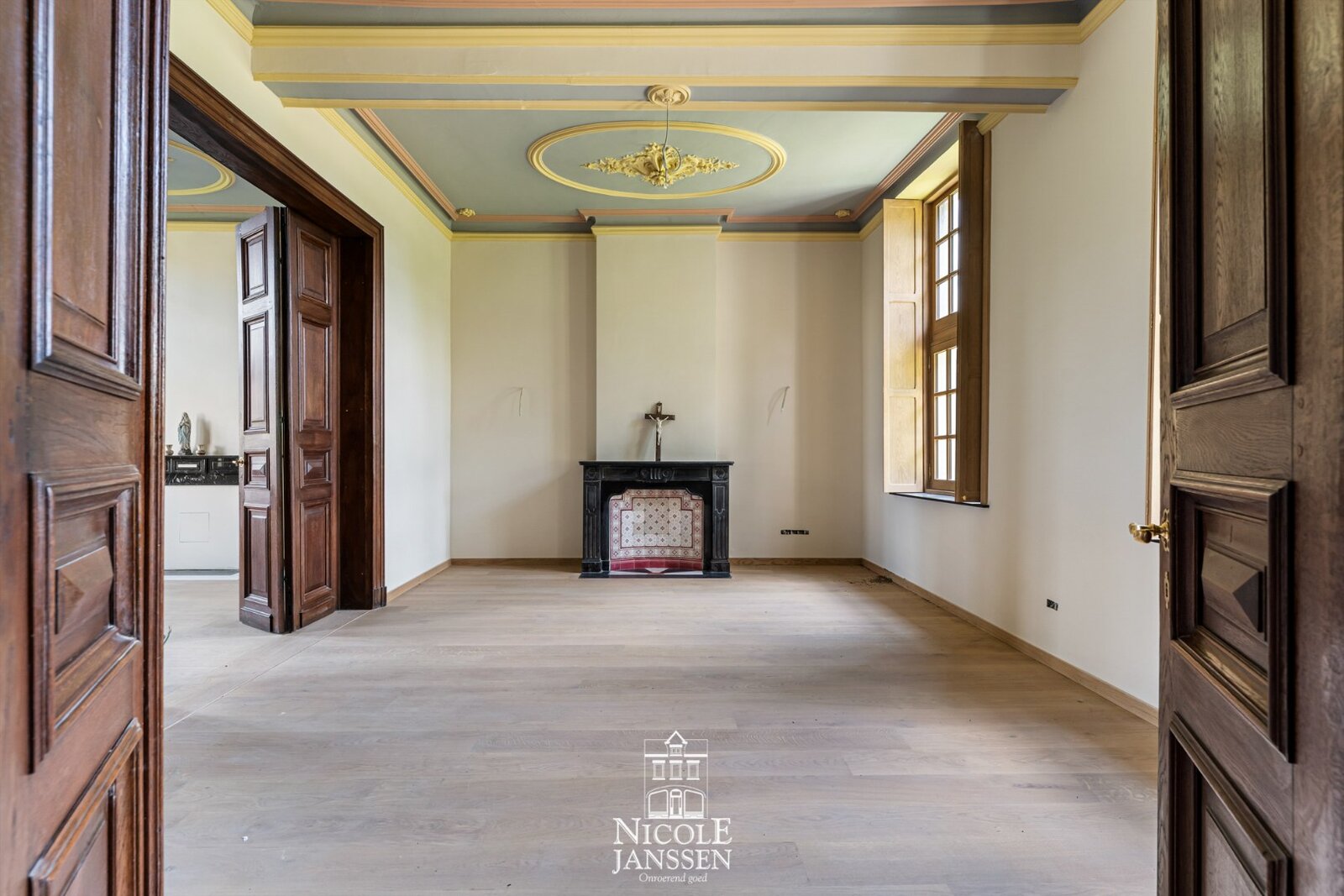 Binnen zorgen hoge plafonds, originele details en authentieke elementen voor een warme, statige sfeer.