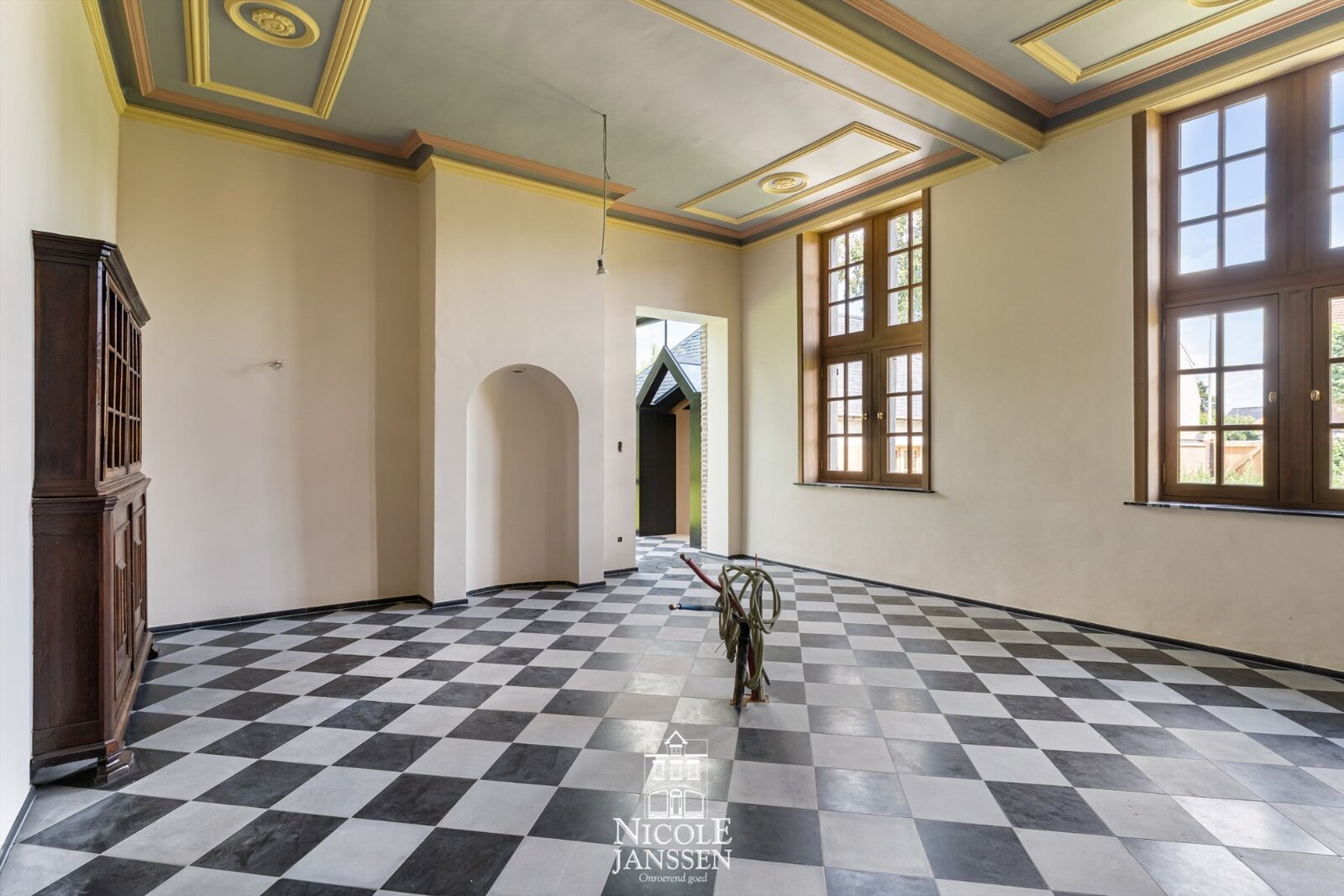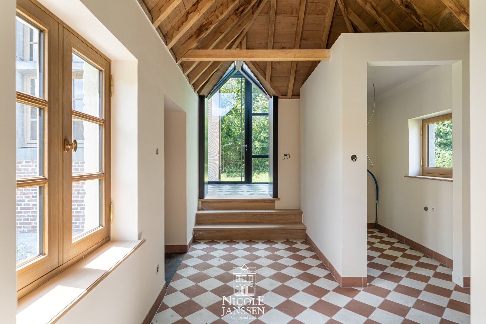 - Ruime inkomhal met een natuurstenen vloer in dambord-motief