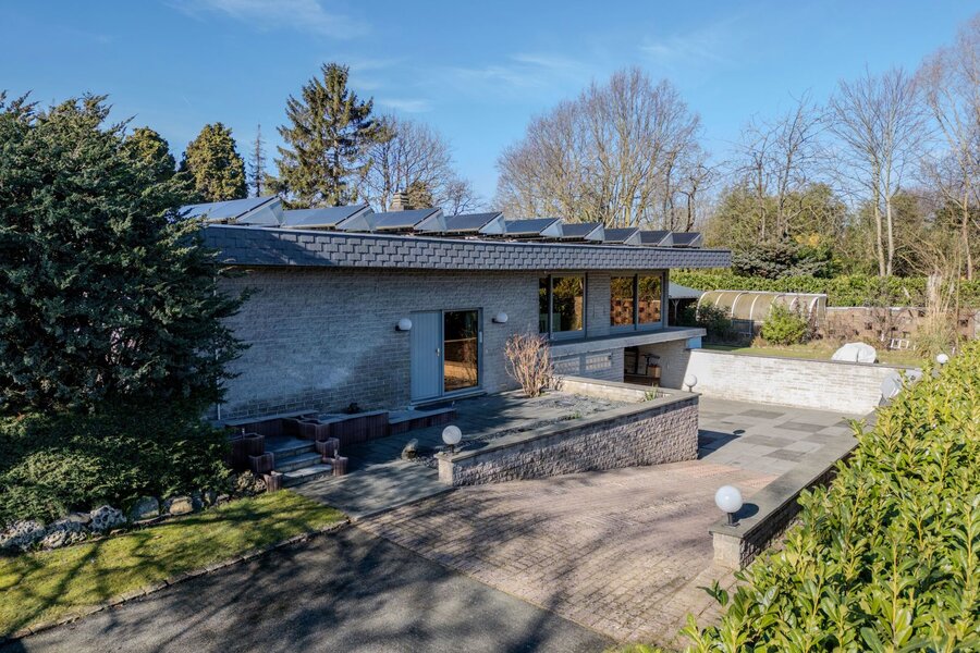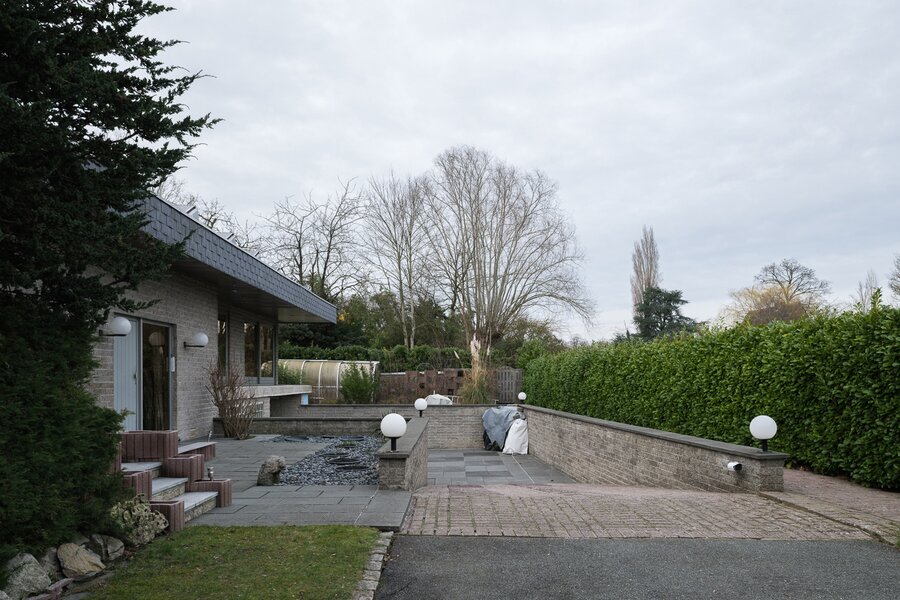 In het rustige Kolegem (Mariakerke) bevindt zich deze karaktervolle woning (1979) in brutalistische stijl, discreet gelegen in tweede bouwlijn op een perceel van maar liefst 2.701 m².