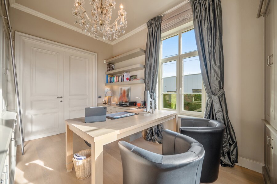 Gelijkvloers met imposante inkomhal en gastentoilet. Leefruimte op parket en natuursteen met open haard, eetkamer en aparte zithoek. Aansluitend een open volledig ingerichte keuken voorzien van kwaliteitstoestellen met een mooie ontbijtruimte. Eveneens op het gelijkvloers een aparte bureau op parket met ingebouwde maatkasten.