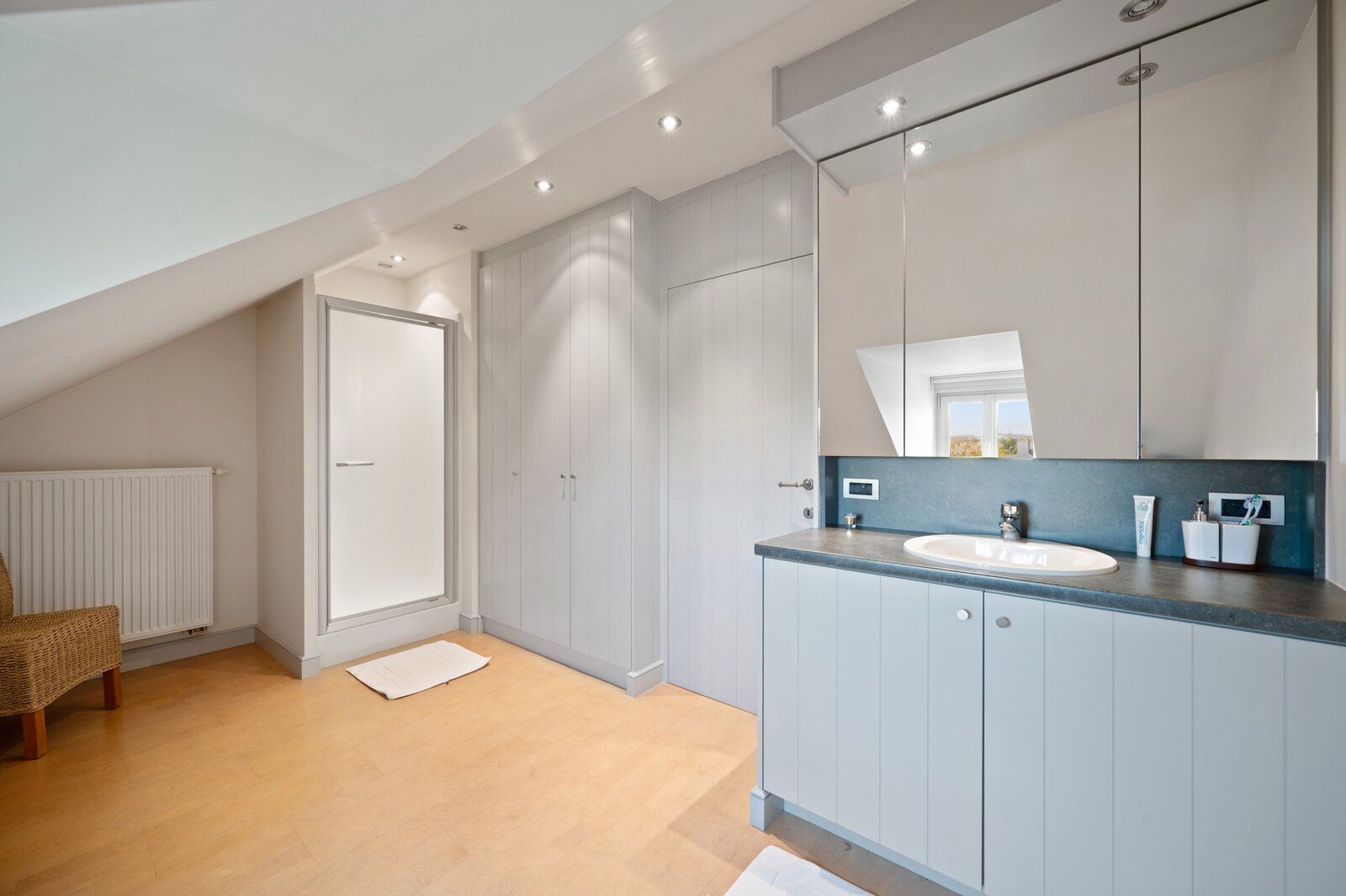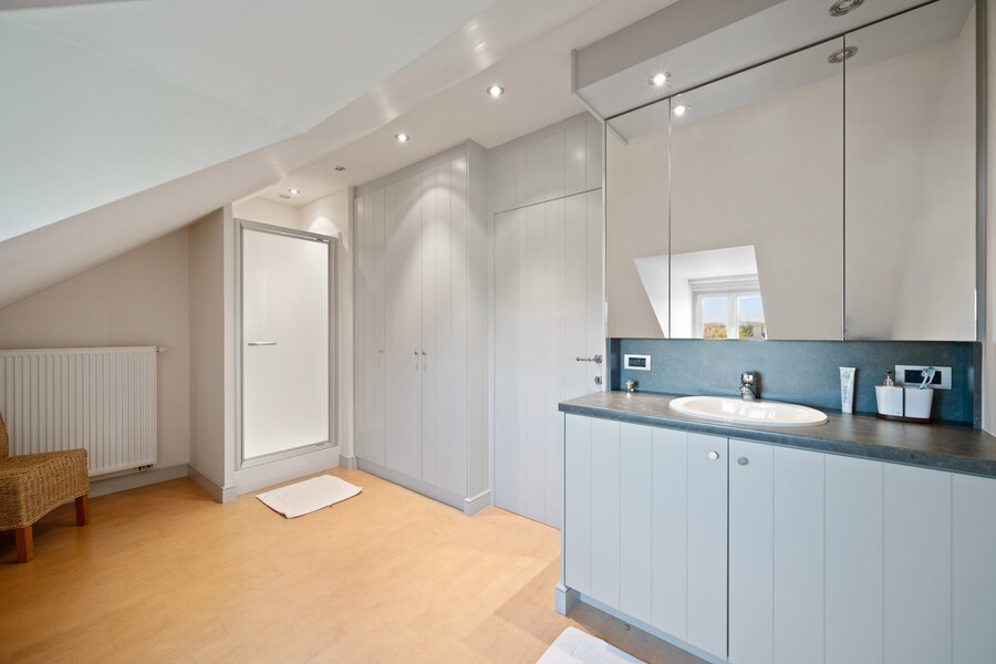 De tweede verdieping kan ingericht worden als aparte woongelegenheid met hal en toilet, een zeer ruime slaapkamer, een badkamer en een opbergzolder.