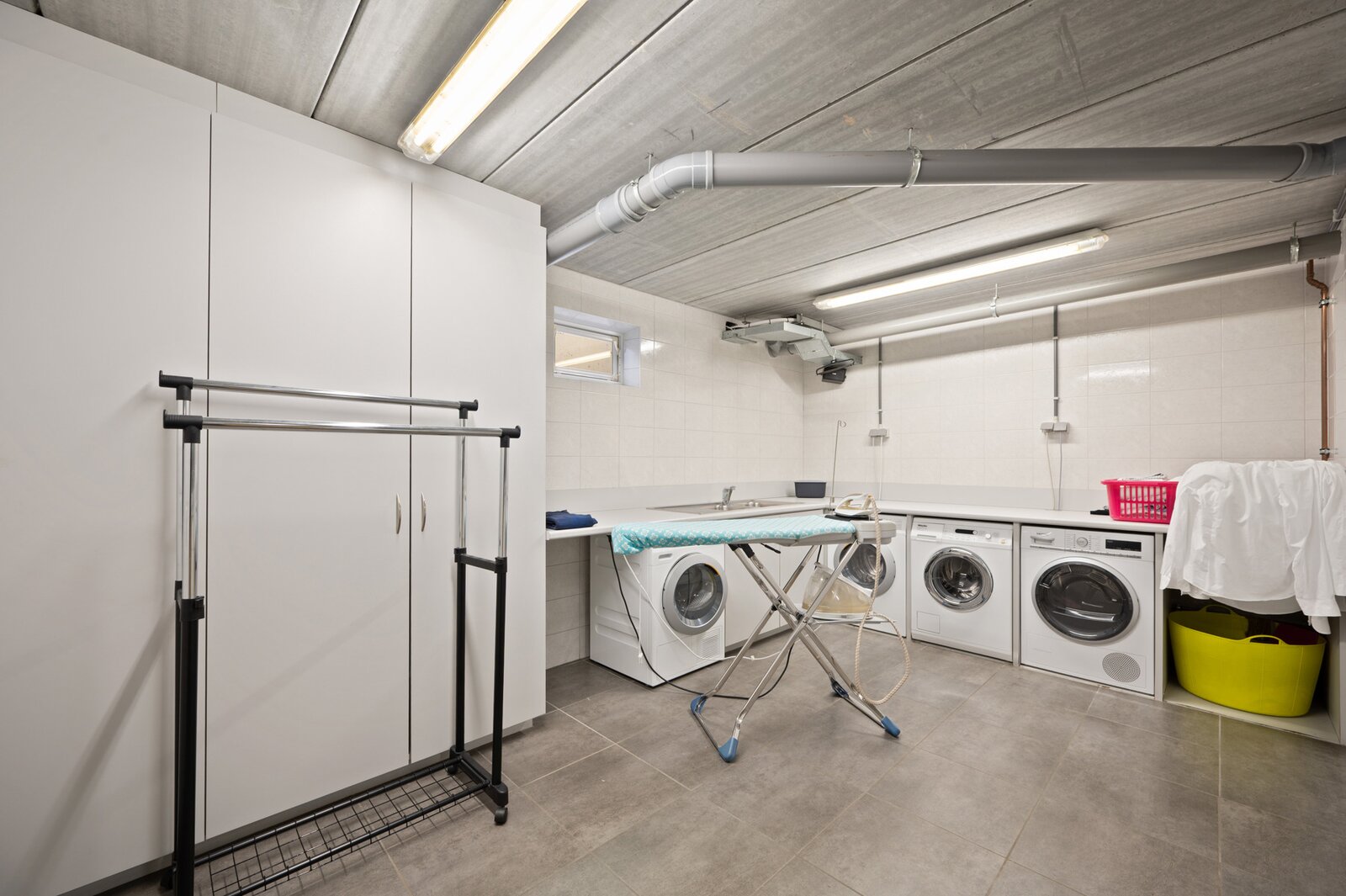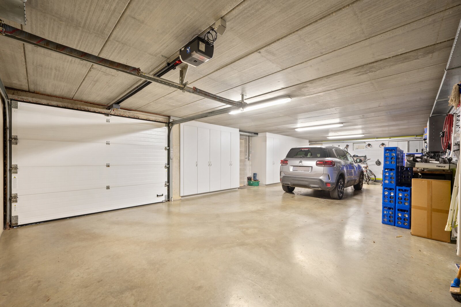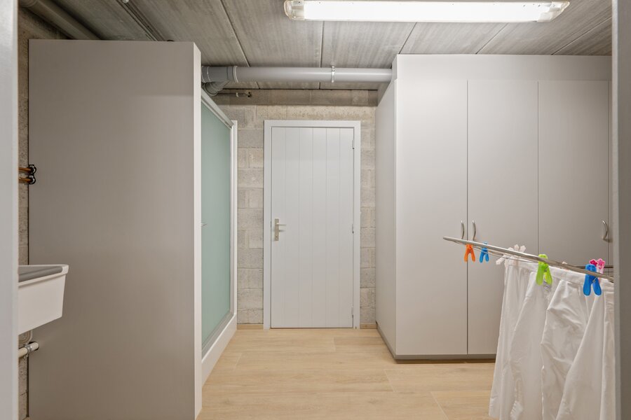 Via de keldertrap kom je in de zeer goed afgewerkte kelder met een ruime garage voor drie auto's, een fitnessruimte, een douchekamer, een wasplaats en een opbergruimte.