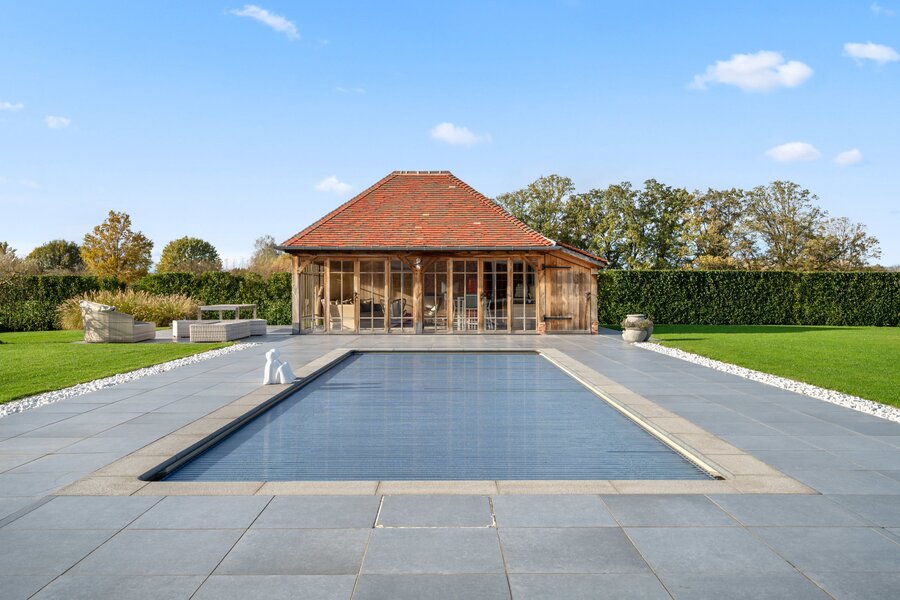 In de tuin vinden we een prachtig buitenzwembad met poolhouse.