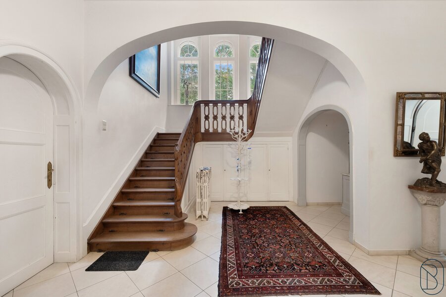 De woning omvat op het gelijkvloers een mooie inkomhal, salon en leefruimte, ingerichte keuken, bibliotheek en bureau.