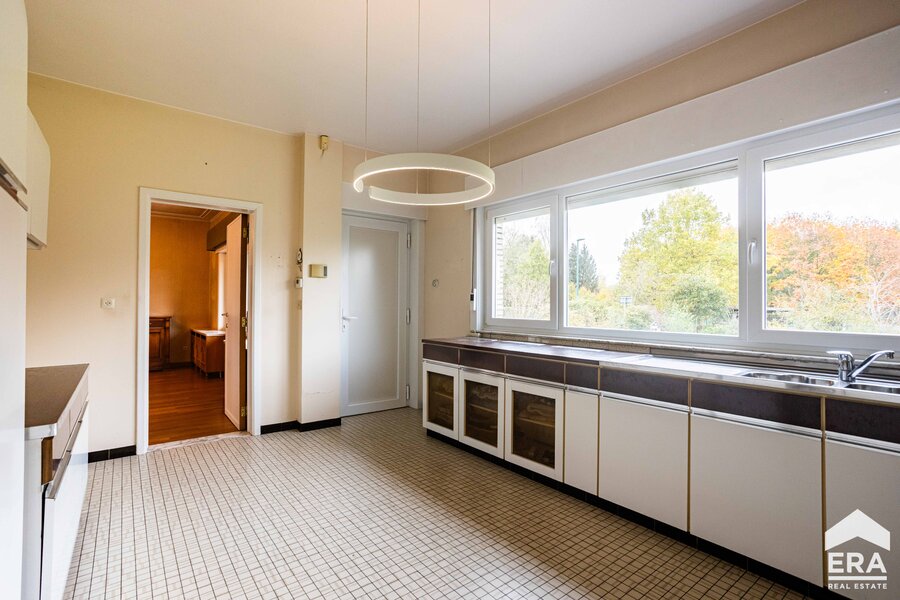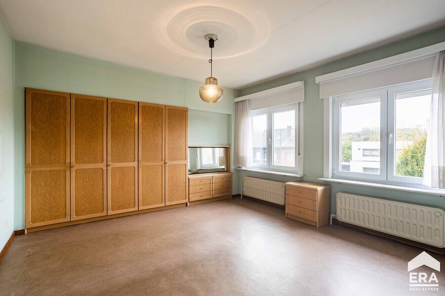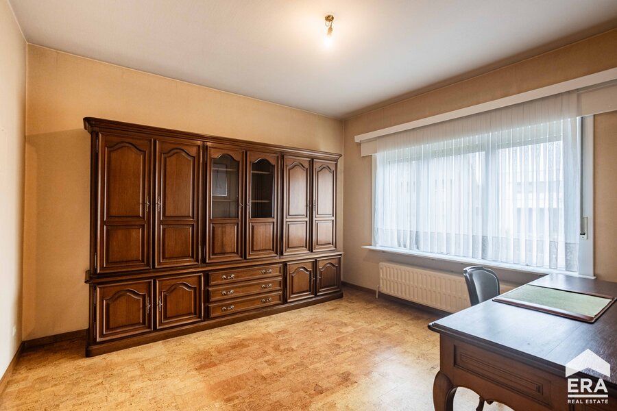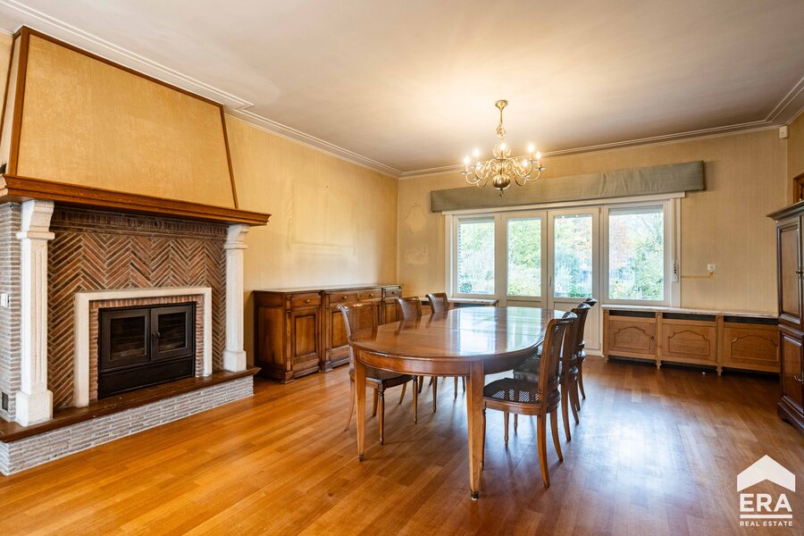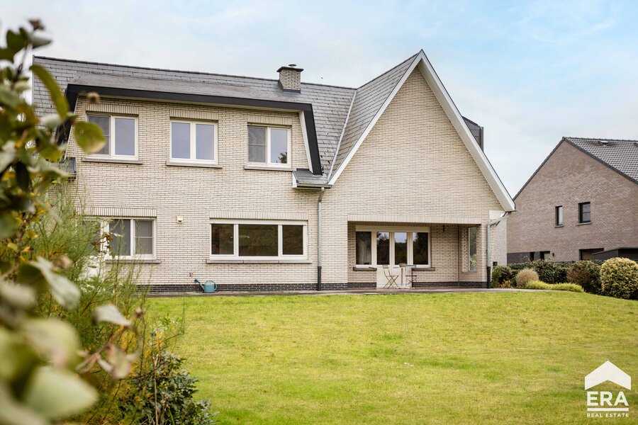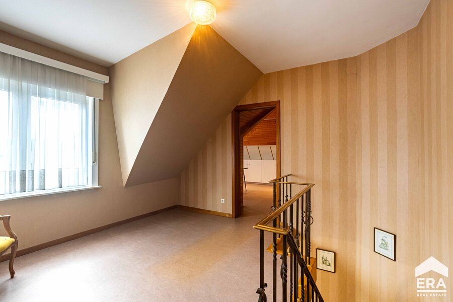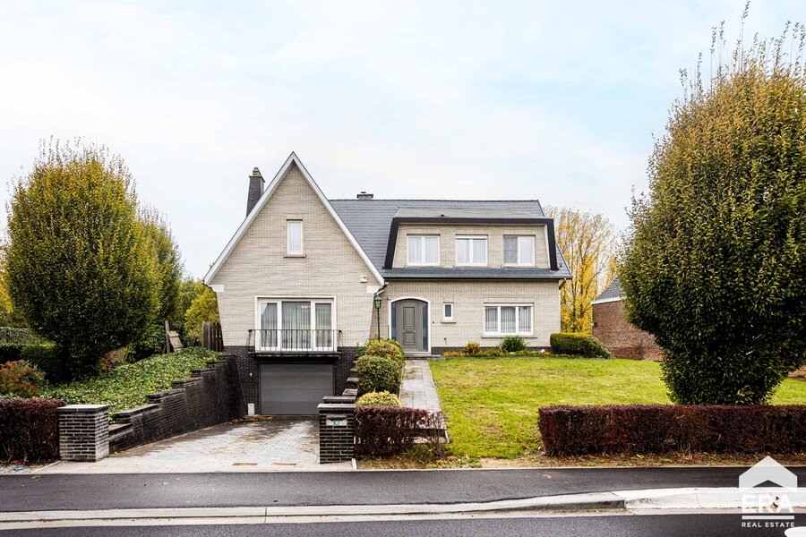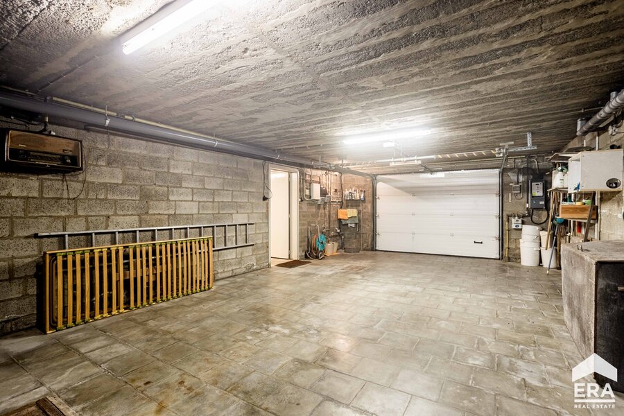 De woning is volledig onderkelderd met meerdere bergruimtes en een dubbele garage met automatische poort. Op het gelijkvloers vind je een ruime inkomhal met apart toilet, een lichtrijke leefruimte met parketvloer en uitzicht op de tuin, een grote keuken (te vernieuwen naar eigen smaak), een wasplaats/bijkeuken en een bureauruimte of extra slaapkamer. De eerste verdieping biedt een overloop, vier royale slaapkamers en een badkamer.