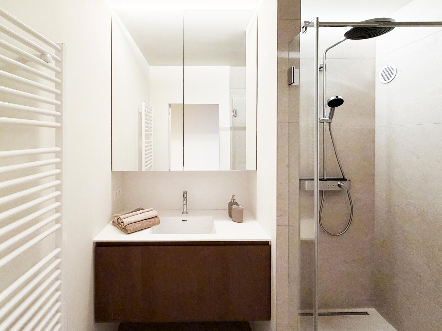De doordachte indeling omvat drie comfortabele slaapkamers en twee luxueus afgewerkte badkamers, perfect geschikt als vaste woonst of als exclusief tweede verblijf. Het appartement is volledig ingericht en biedt bovendien de mogelijkheid om de zorgvuldig geselecteerde designmeubelen mee aan te kopen, wat een onmiddellijke en zorgeloze intrek mogelijk maakt.