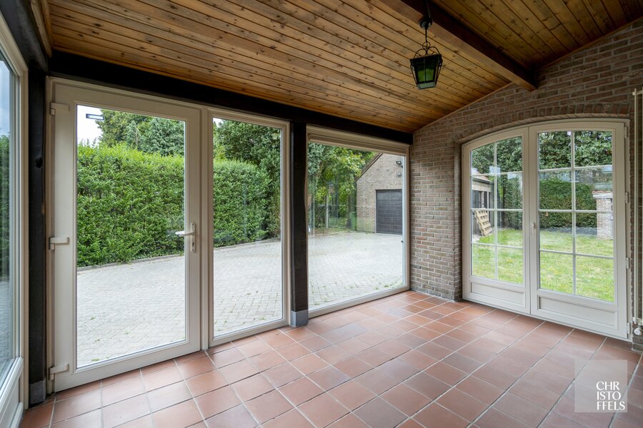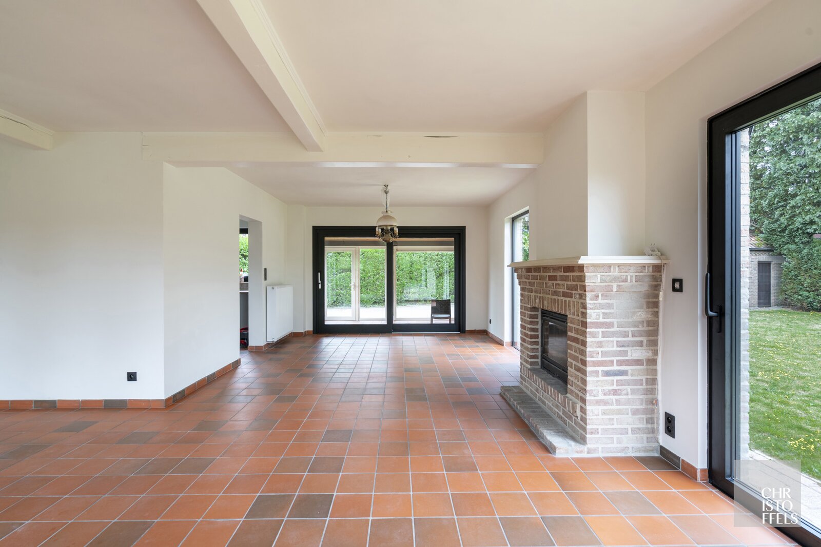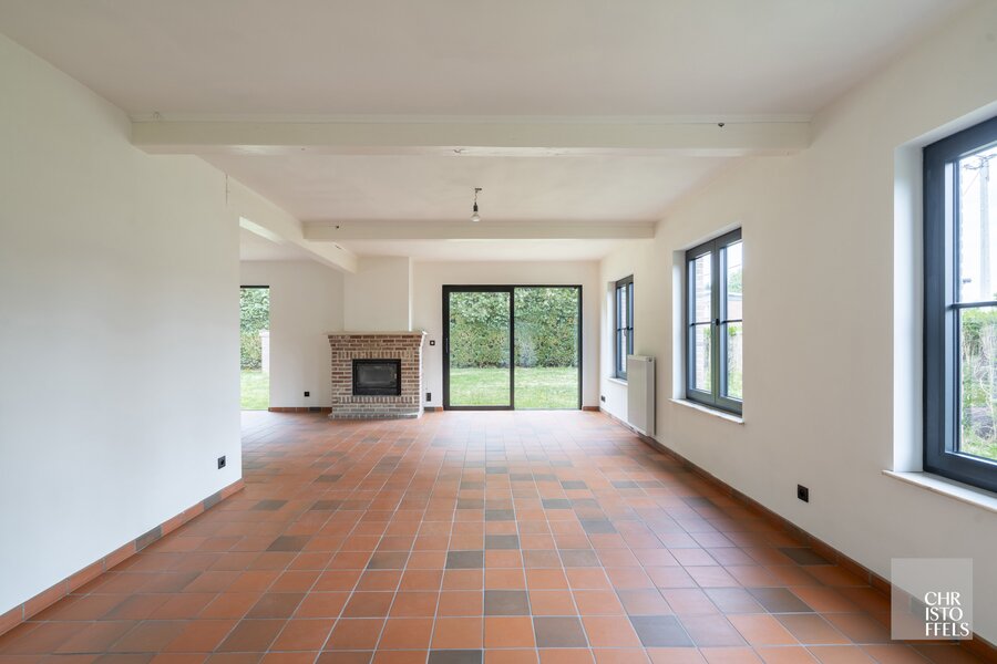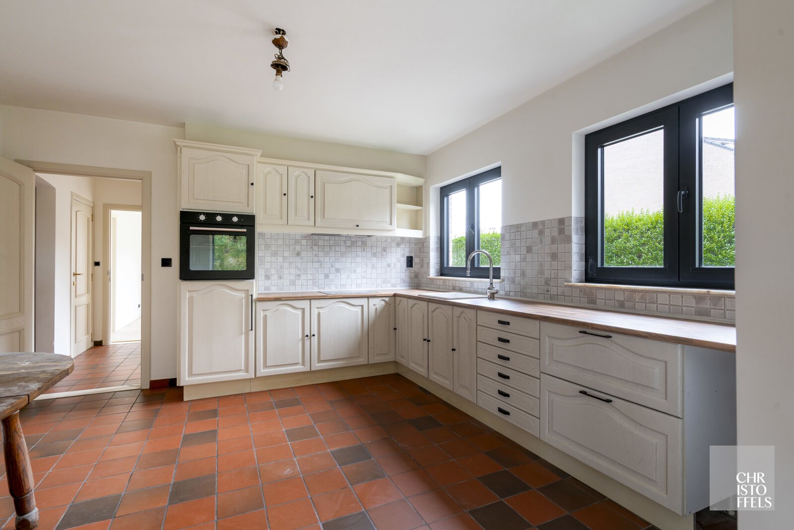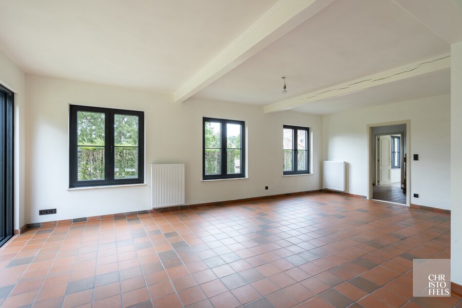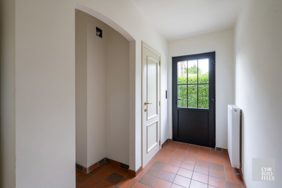 Op het gelijkvloers komt u binnen via een ruime inkomhal met vestiairehoek en gastentoilet. Er is een authentieke terracottavloer aanwezig. De aangename leefruimtes bestaan uit een gezellige woonkamer met haardcassette en een eetkamer, die samen zorgen voor een open en luchtige indeling. Aansluitend bevindt zich een veranda die veel licht binnenbrengt en uitkijkt op de tuin. De keuken is uitgerust met kwalitatieve inbouwtoestellen en biedt voldoende ruimte voor comfortabel koken. Op het gelijkvloers bevinden zich ook, naar wens, één of twee slaapkamers of praktijk-/kantoorruimtes met aparte toegang.