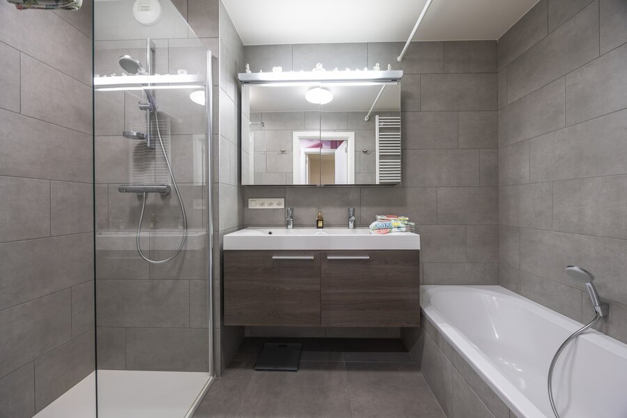 - Stijlvolle badkamer met bad, inloopdouche en dubbele lavabo