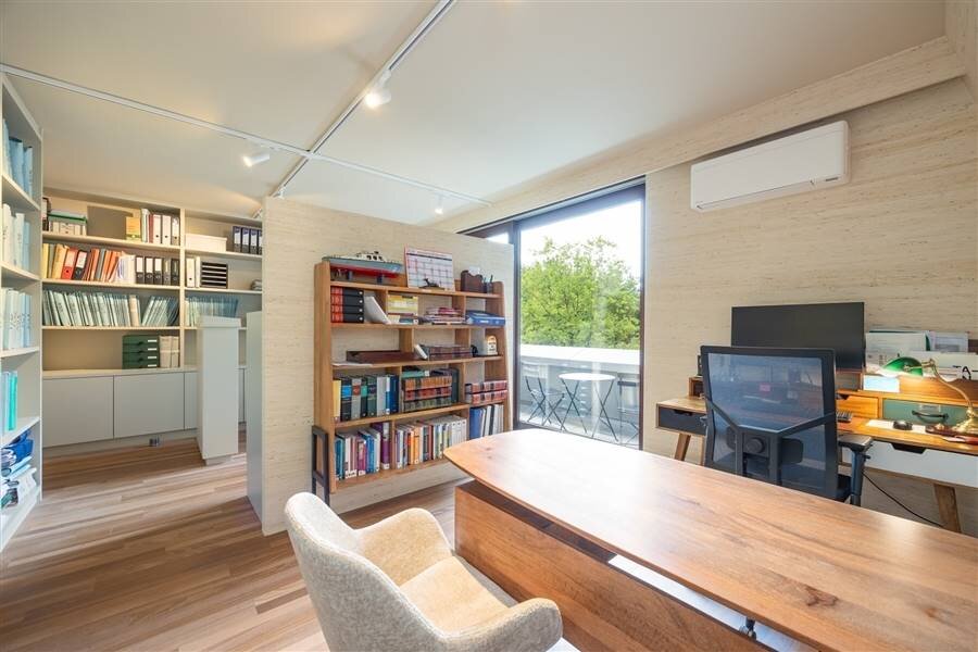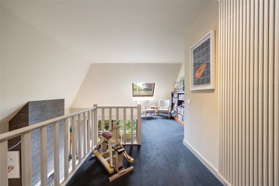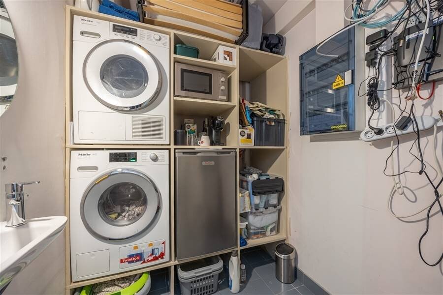 Via lift bereik je de 3de verdieping met inkomhal, gastentoilet, lichtrijke leefruimte met open haard en terras, mezzanine, luxe ingerichte keuken met AEG-toestellen en eethoek. Verder een bureauruimte met terras (mogelijke extra slaapkamer), een slaapkamer en een praktische wasplaats/berging.