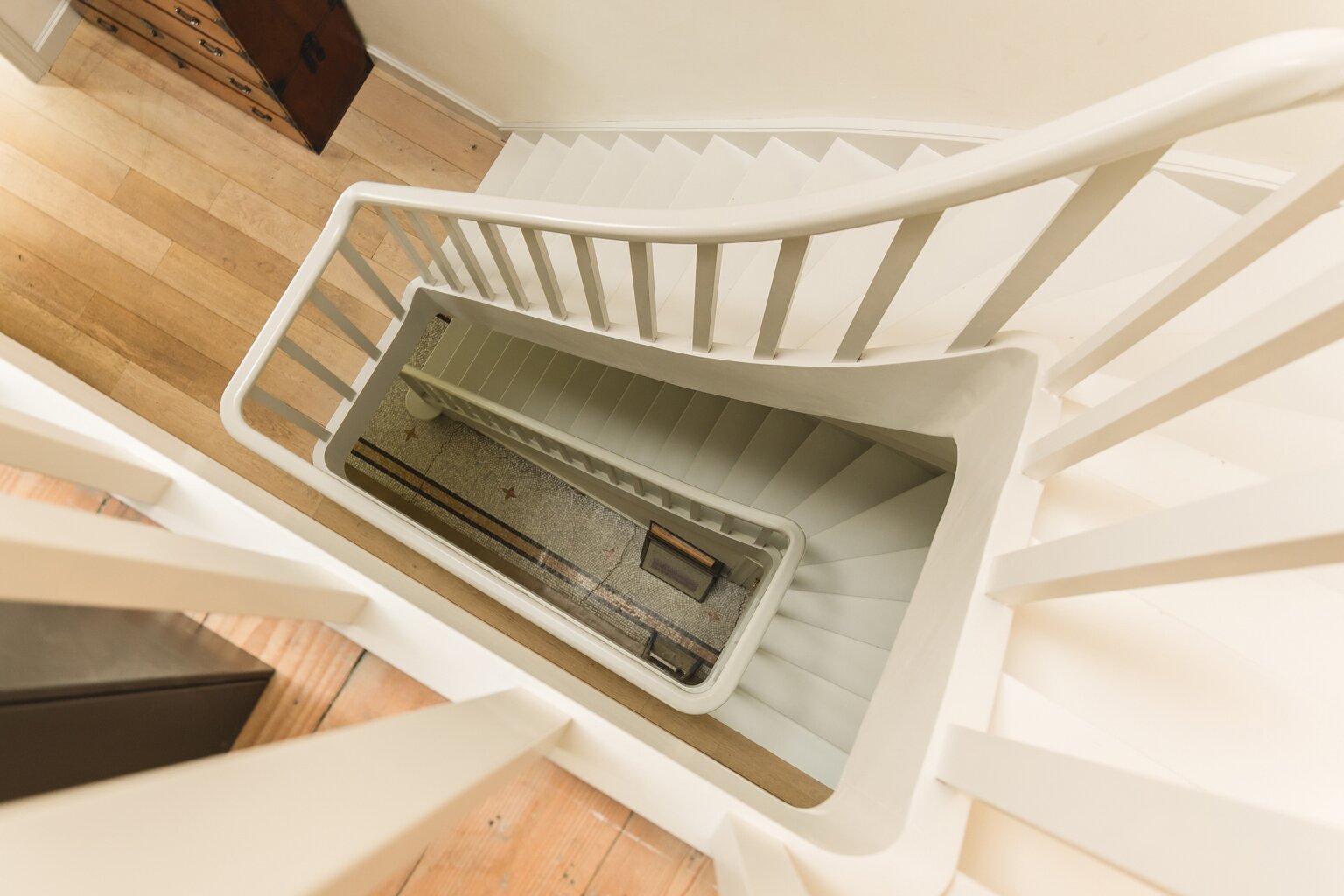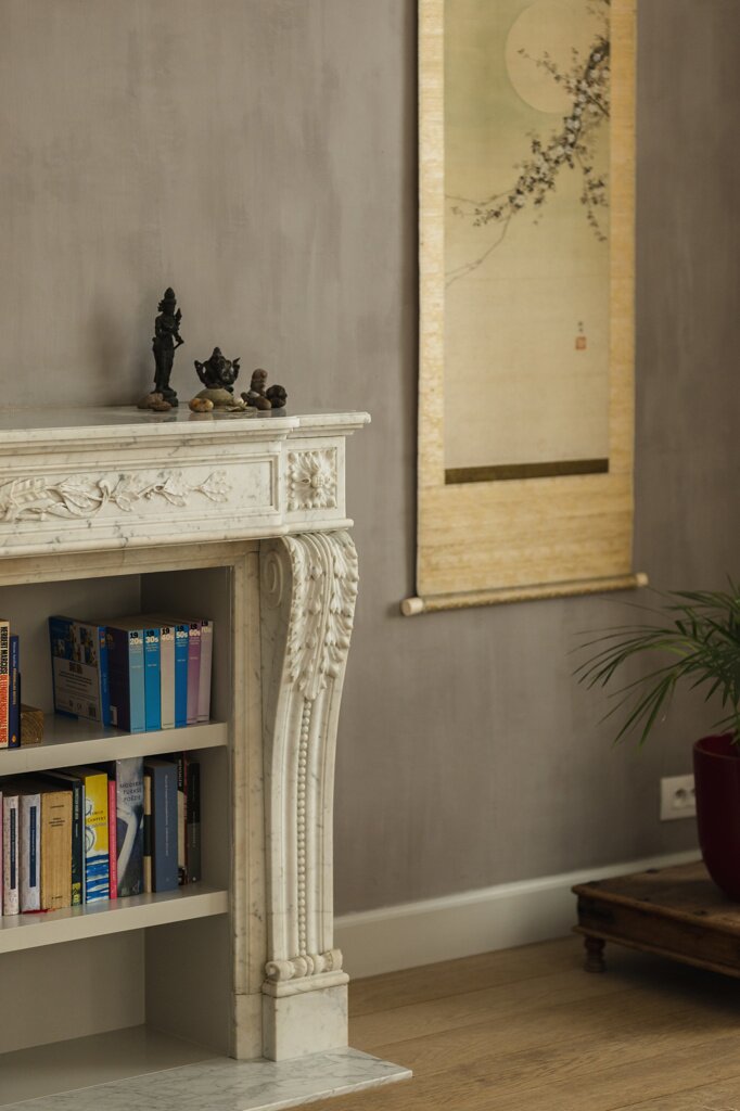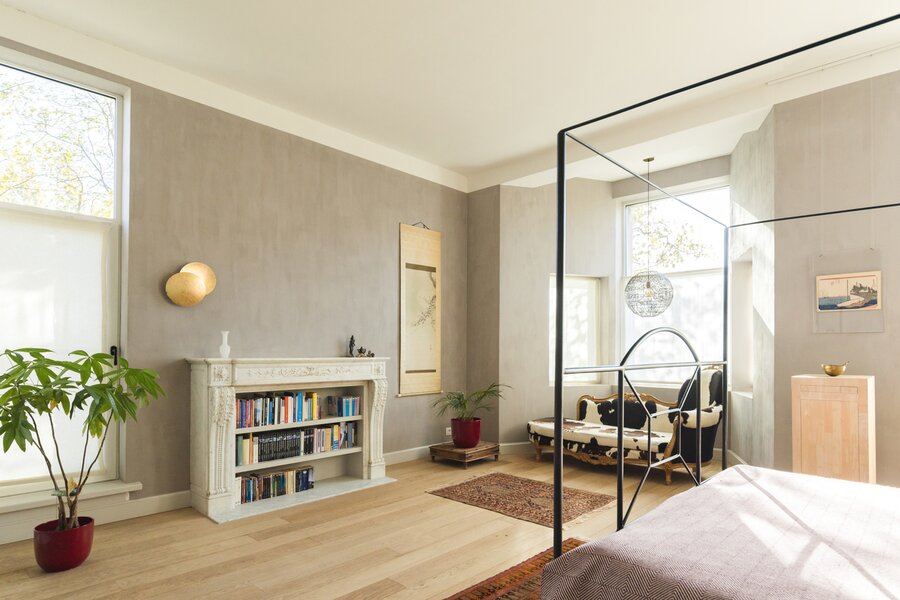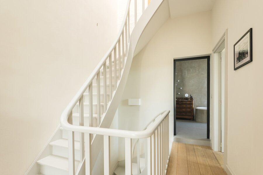 Op +1: grote slaapkamer met twee terrasjes vooraan en tweede slaapkamer met erker, nu muziekkamer. Badkamer in StucDeco met muurverwarming tot in de douche toe, heerlijk! Grote wasplaats. Op +2 vooraan een slaapkamer, nu fantastisch atelier, middenplaats en achteraan de vierde slaapkamer met tweede badkamer.