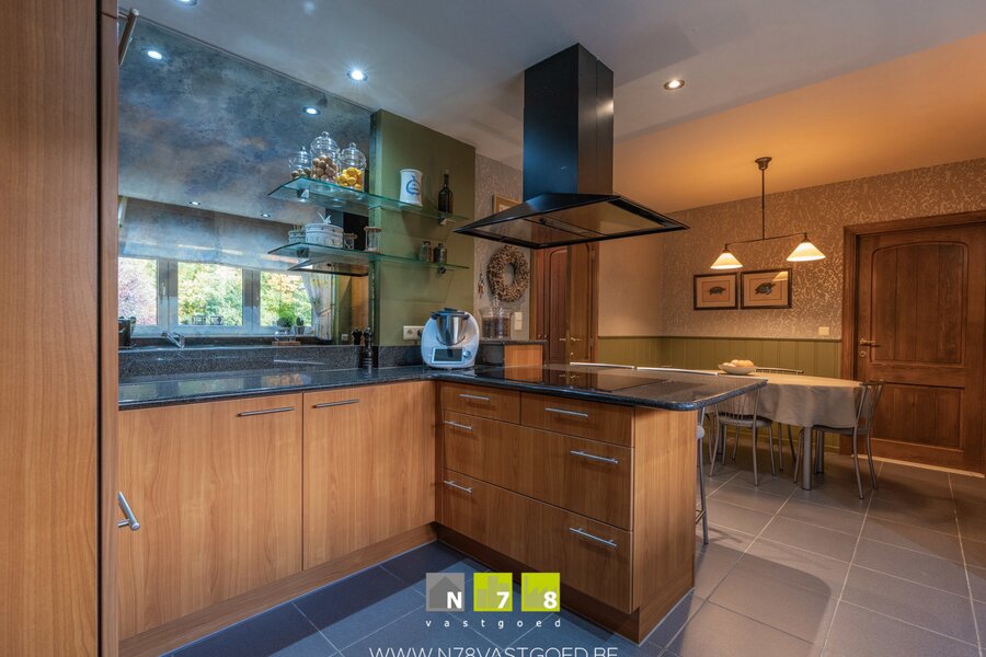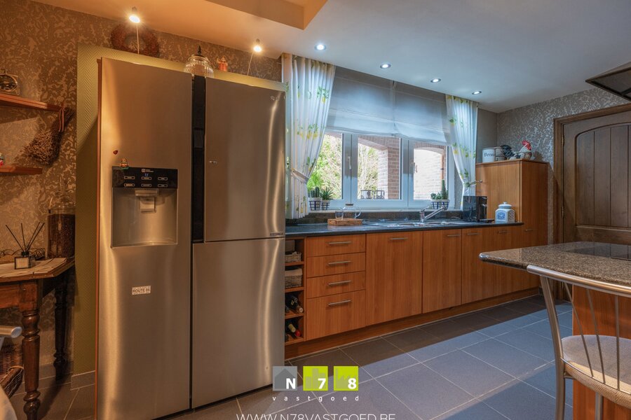 - Keuken (5,65m x 3,15m=17,80m²): onder- en bovenkasten, vaatwasser, dubbele spoelbak, oven, micro, inductiekookplaat, dampkap, granieten werkblad, Amerikaanse koelkast, tegelvloer.