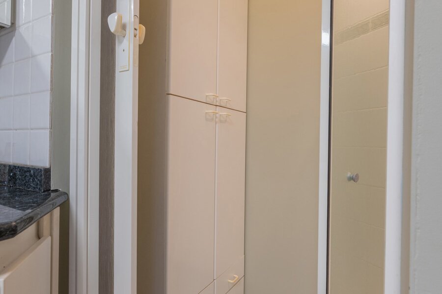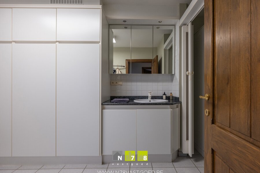 - Wasplaats (2,20m x 4,80m=10,56m²): inbouwkasten, lavabo met onderkast, douche, aansluiting wasmachine & droogkast, tegelvloer.