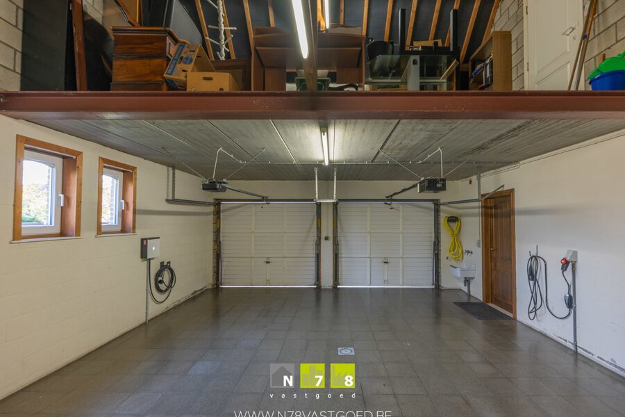 - Inpandige garage (5,90m x 8,00m=47,2m²): dubbele automatische kantelpoorten, uitgietbak, luik naar kelder, deur naar terras/tuin, tegelvloer.