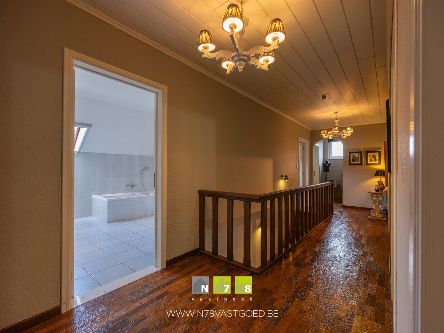 - Overloop (2,00m x 9,40m=18,8m²): kurkvloer.