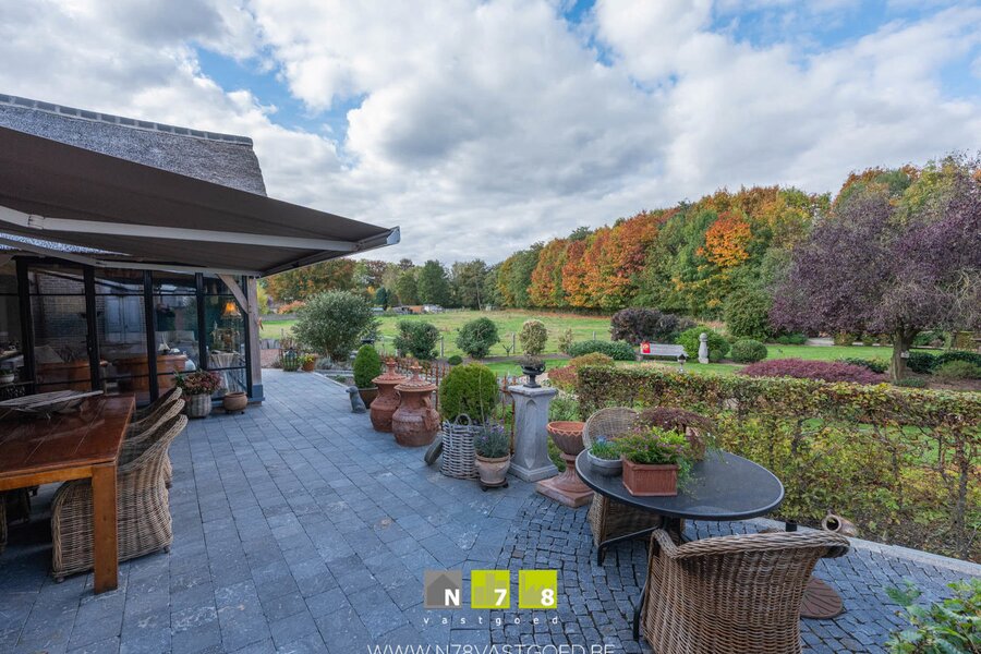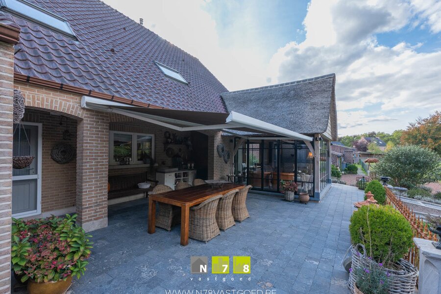 - Terras in natuursteen met zonneluifel, deels overdekt, perfect voor buitenleven.