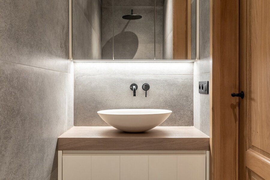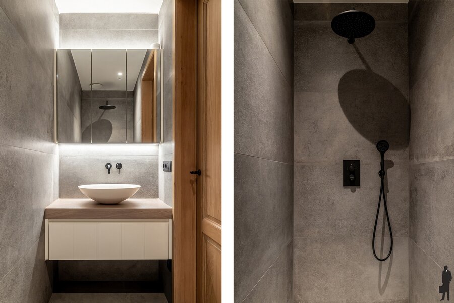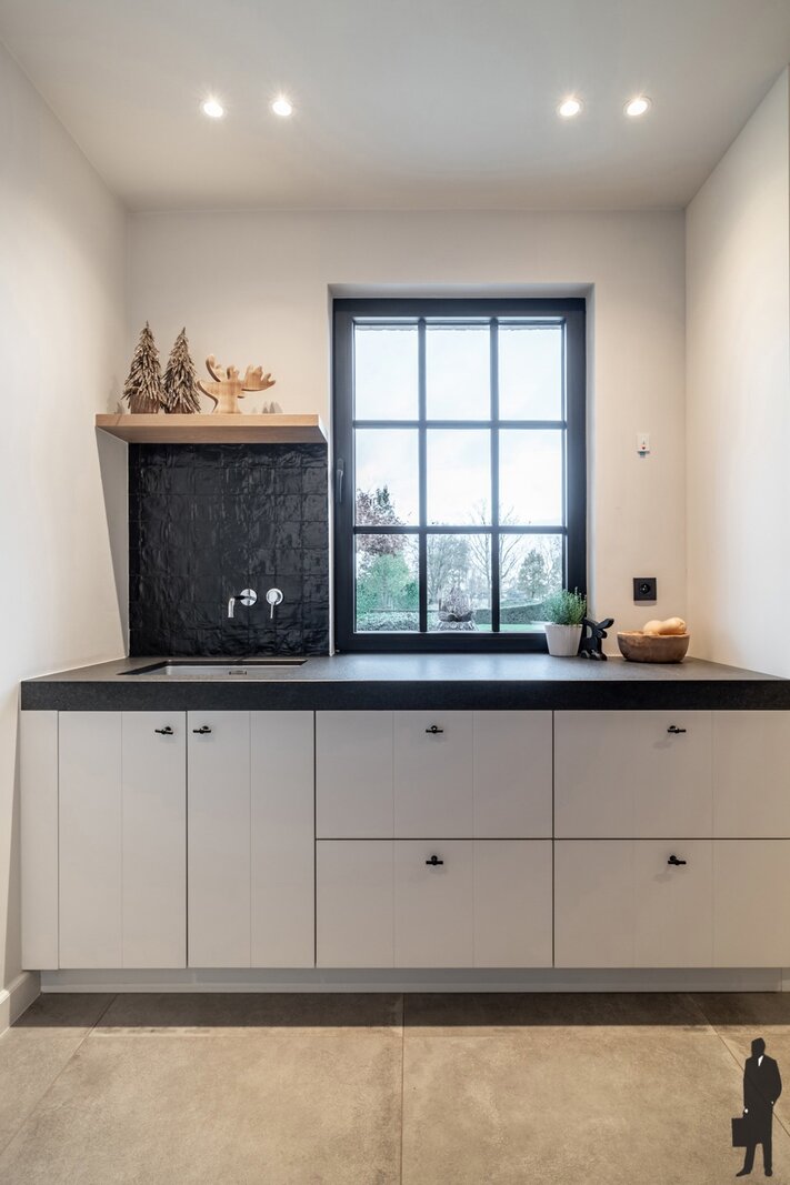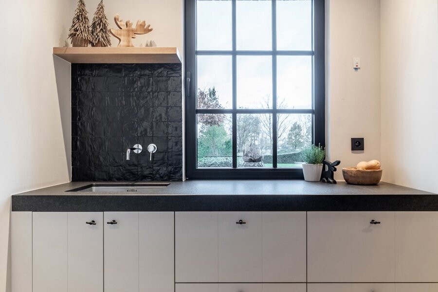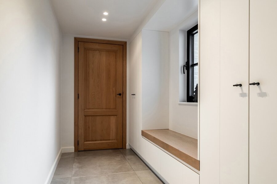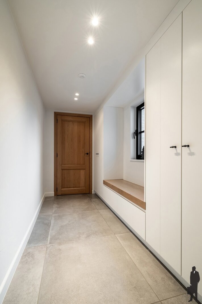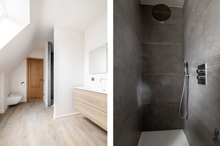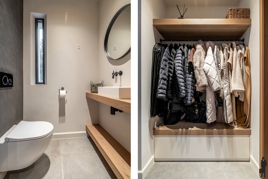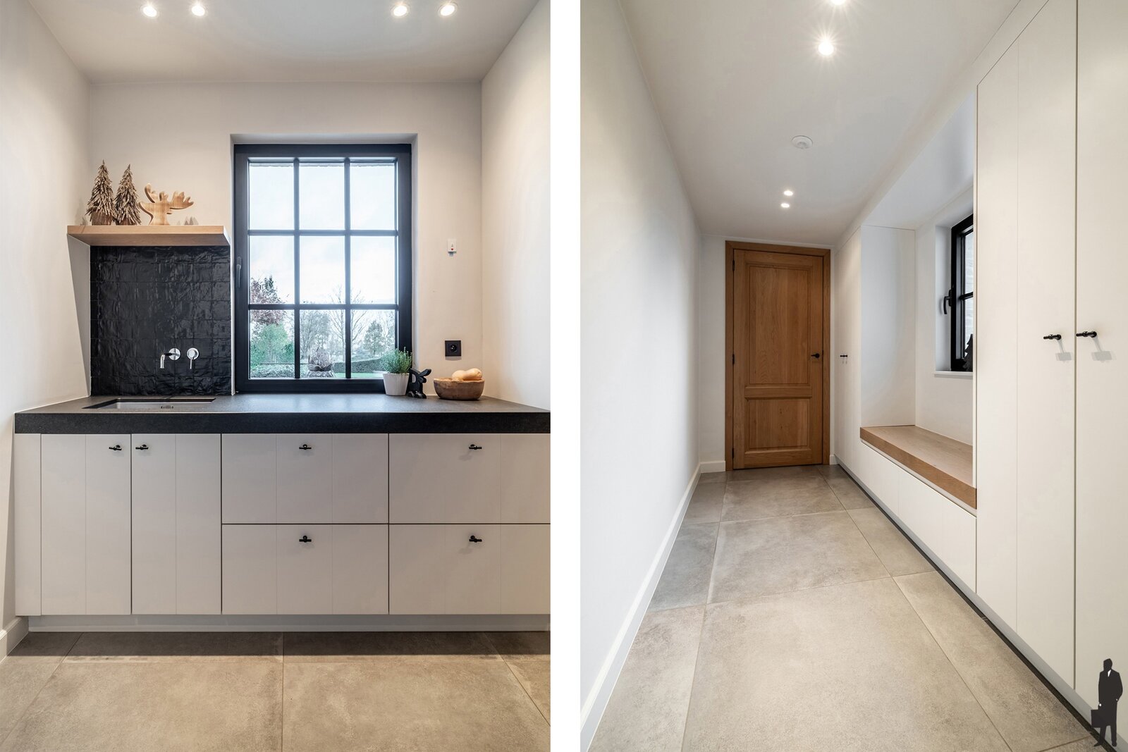 Op de verdieping liggen de master suite met inloopkast, twee extra slaapkamers, een luxe badkamer en een praktische technische ruimte met installatie voor warmtepomp en vloerverwarming.