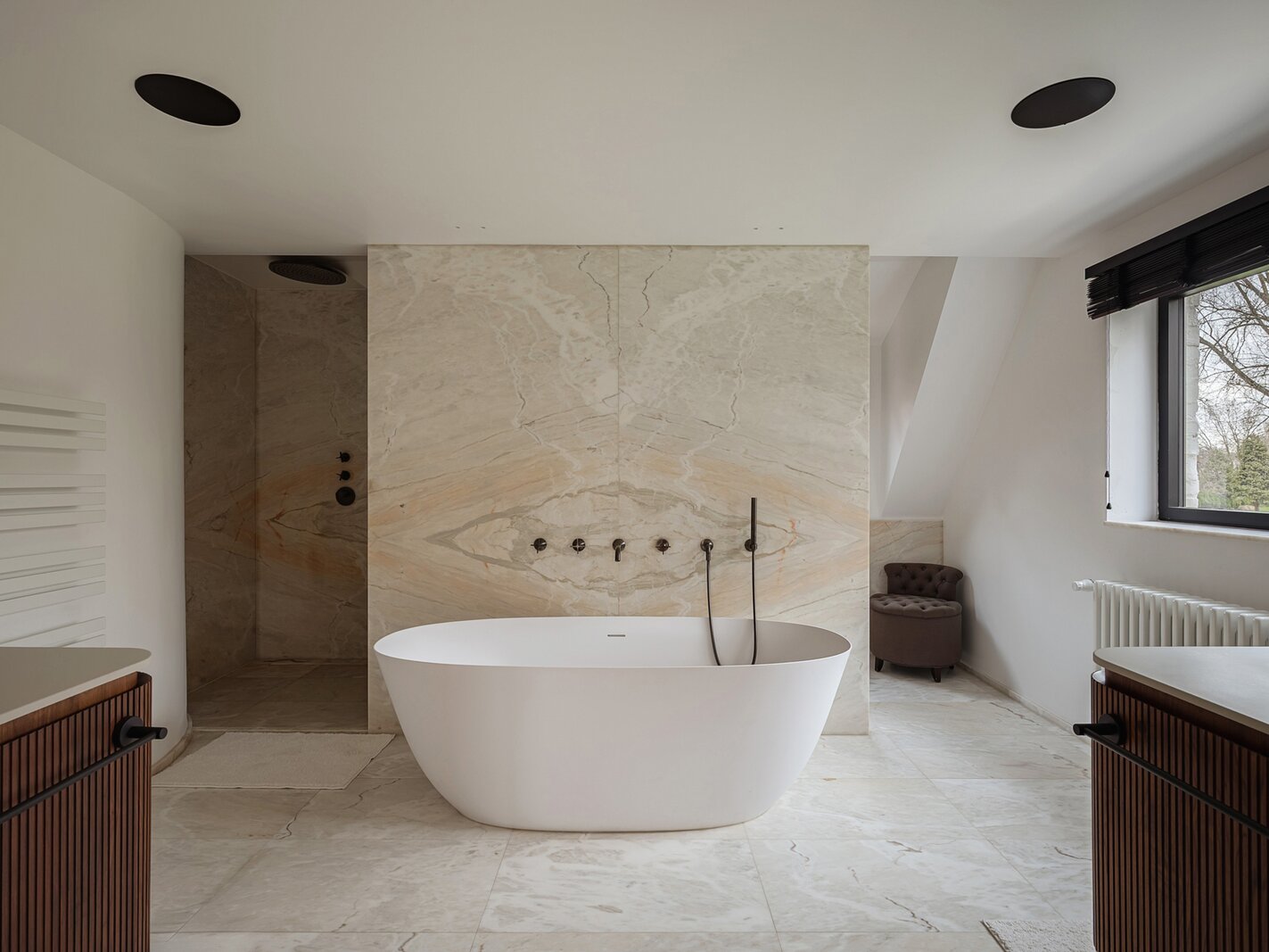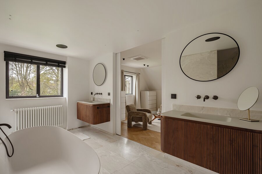 Het hoofdgebouw verwelkomt u met een living rondom een sfeervolle open haard, een bureau en een cinema room. De ruime eetkamer en de royale keuken, uitgerust met hoogwaardige Gaggenau-apparatuur, vormen het hart van het huis en stralen warmte en verfijning uit. Vijf slaapkamers, elk met een eigen badkamer, bieden een serene intimiteit, terwijl een aparte wellnessruimte met buitenzwembad, hammam en jacuzzi uitnodigt tot volledige ontspanning. Het domein beschikt ook over een gastenverblijf met twee slaapkamers, een badkamer en een volledig uitgeruste moderne keuken. Een overdekt buitenterras opent zich naar het omringende groen en biedt een adembenemend panoramisch uitzicht.