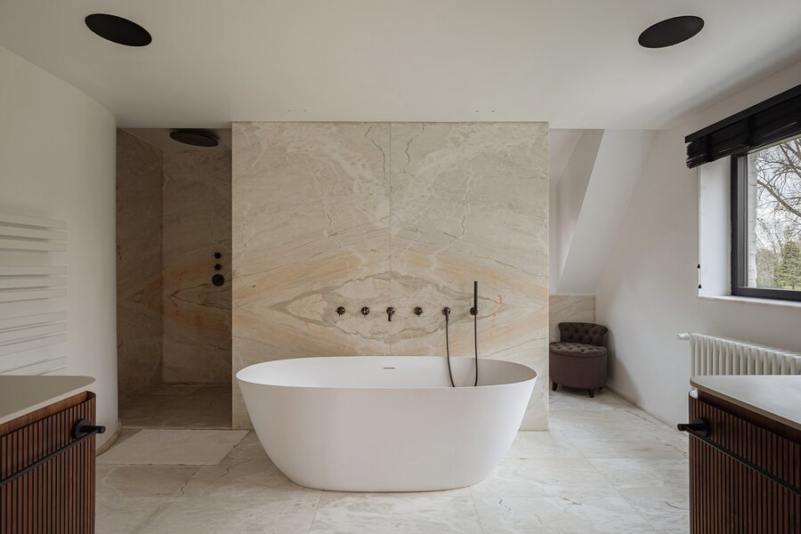 Het hoofdgebouw verwelkomt u met een living rondom een sfeervolle open haard, een bureau en een cinema room. De ruime eetkamer en de royale keuken, uitgerust met hoogwaardige Gaggenau-apparatuur, vormen het hart van het huis en stralen warmte en verfijning uit. Vijf slaapkamers, elk met een eigen badkamer, bieden een serene intimiteit, terwijl een aparte wellnessruimte met buitenzwembad, hammam en jacuzzi uitnodigt tot volledige ontspanning. Het domein beschikt ook over een gastenverblijf met twee slaapkamers, een badkamer en een volledig uitgeruste moderne keuken. Een overdekt buitenterras opent zich naar het omringende groen en biedt een adembenemend panoramisch uitzicht.