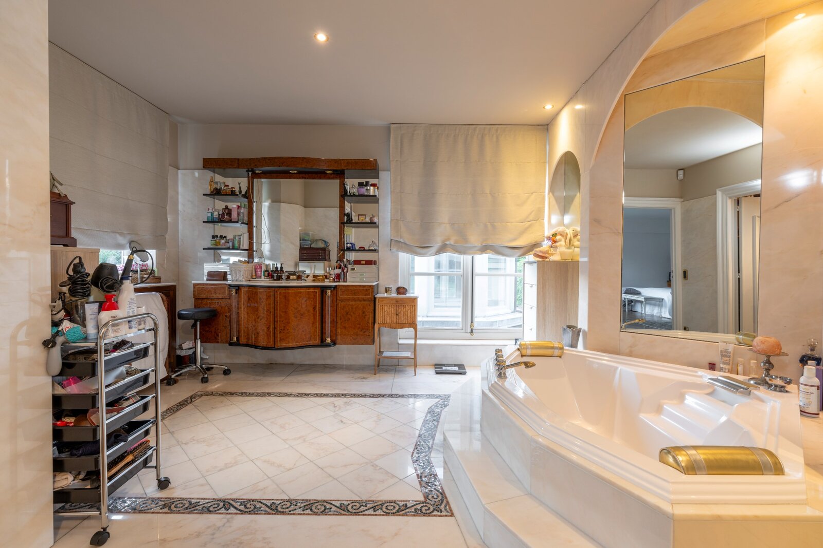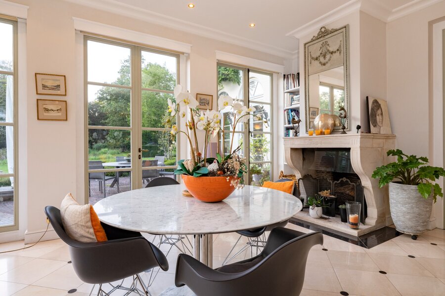 De L-vormige leefomgeving, bestaande uit het ontvangstsalon, eetruimte met een verbinding naar de uitgeruste leefkeuken, biedt een connectie met de parktuin dankzij de verschillende raampartijen die gericht zijn naar de prachtige aangelegde parktuin.