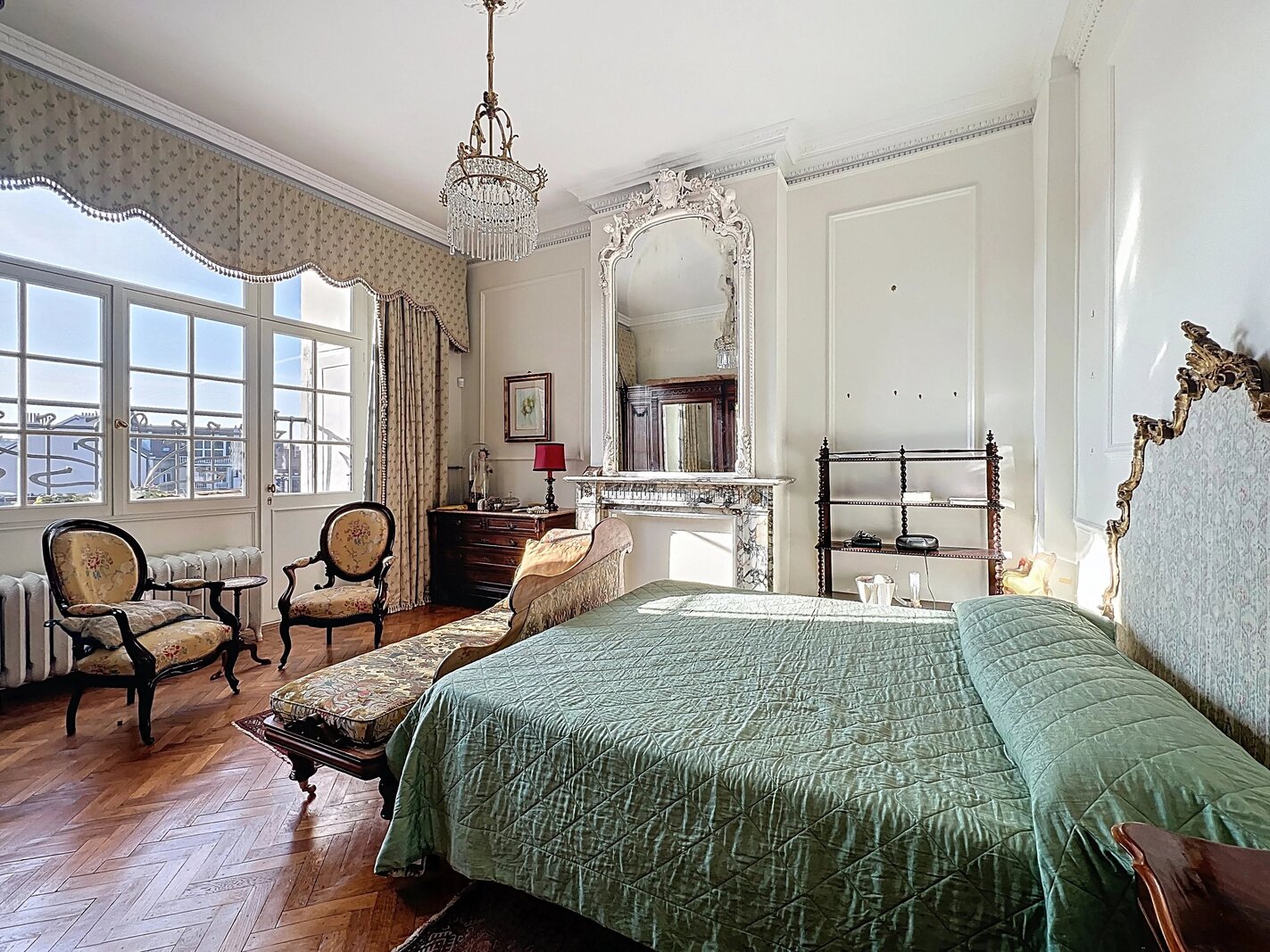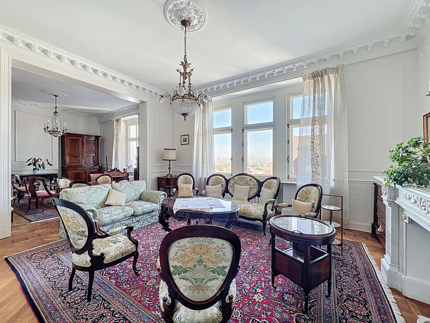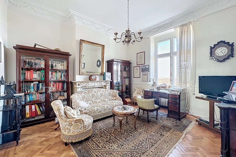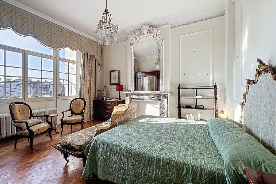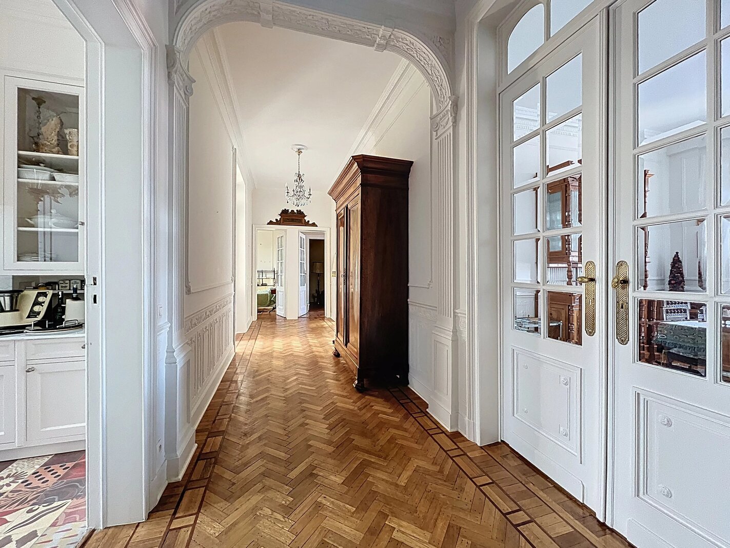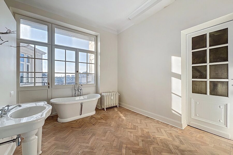 Het appartement bestaat uit ruime, mooie ontvangstruimten met parketvloer en hoge plafonds (3,50 m), een aparte keuken met balkon, drie slaapkamers en twee badkamers.