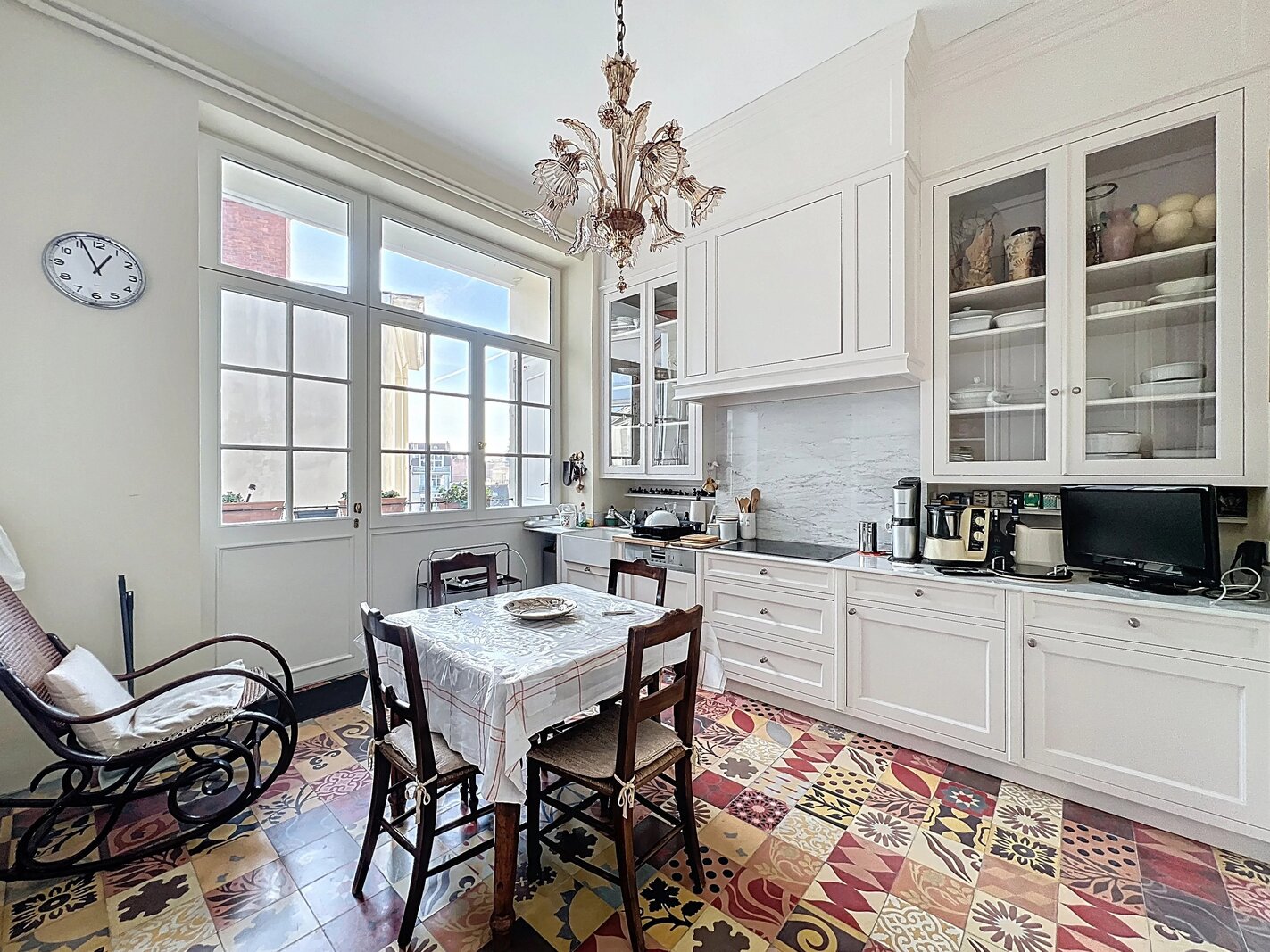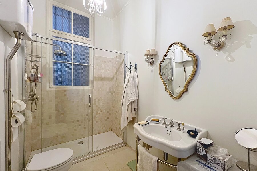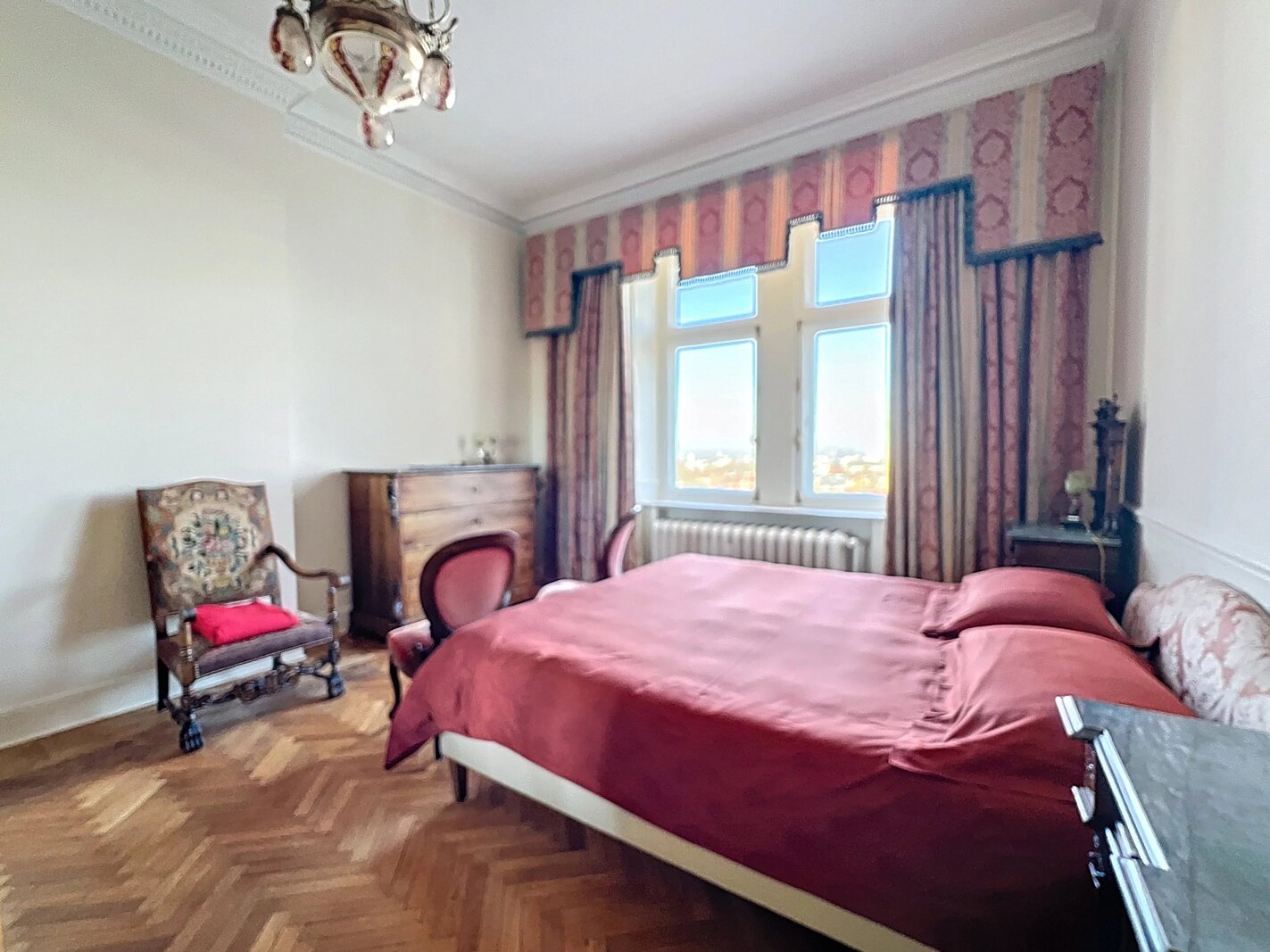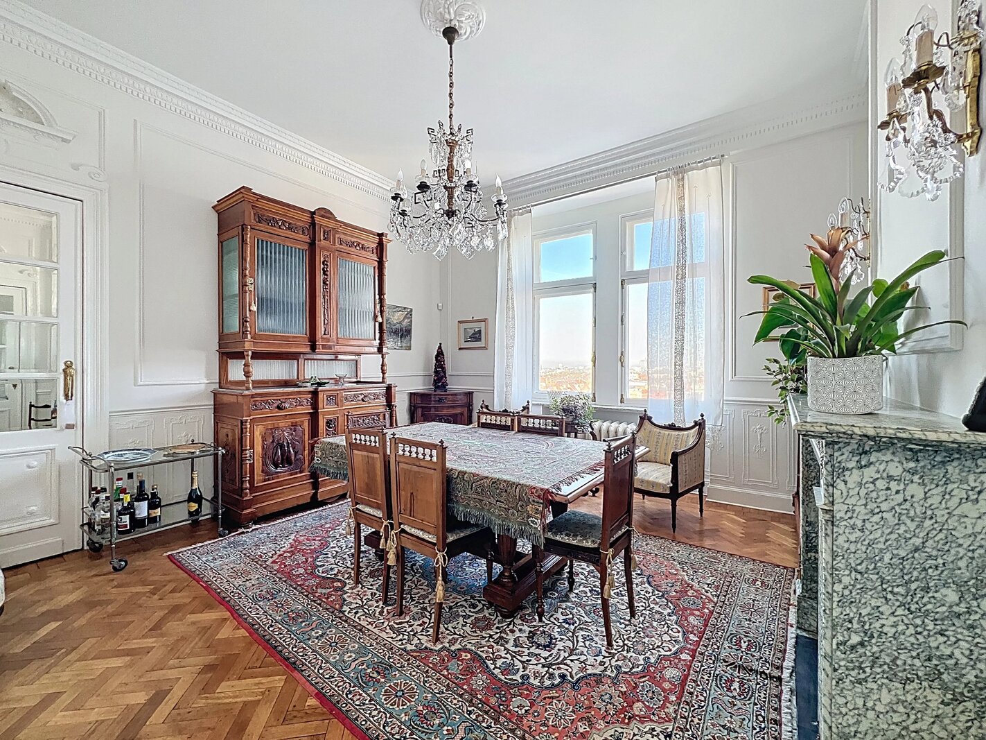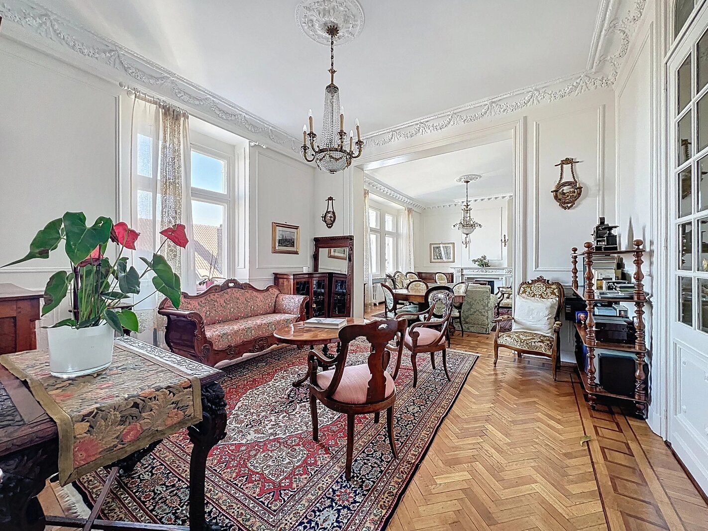 Het appartement bestaat uit ruime, mooie ontvangstruimten met parketvloer en hoge plafonds (3,50 m), een aparte keuken met balkon, drie slaapkamers en twee badkamers.