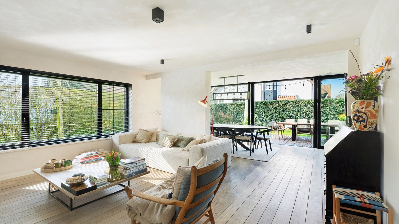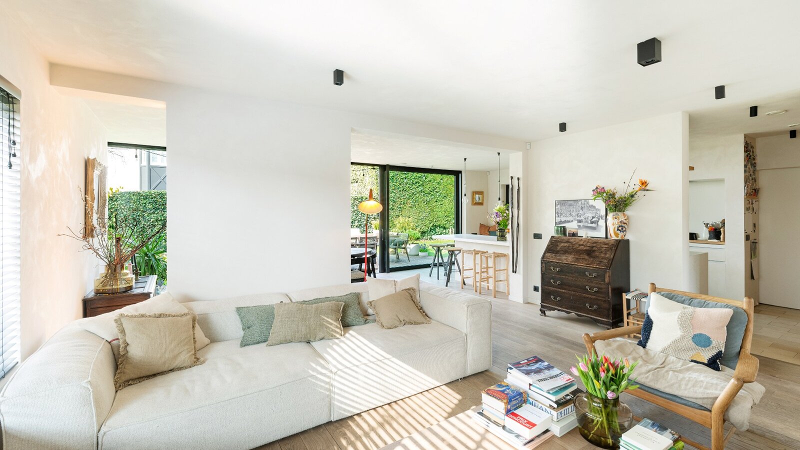 Buiten kunt u genieten van een aangename tuin op het zuidwesten en een zonnig terras (zuid-west), perfect voor mooie dagen. Praktische tuinberging alsook een overdekt terrasje.