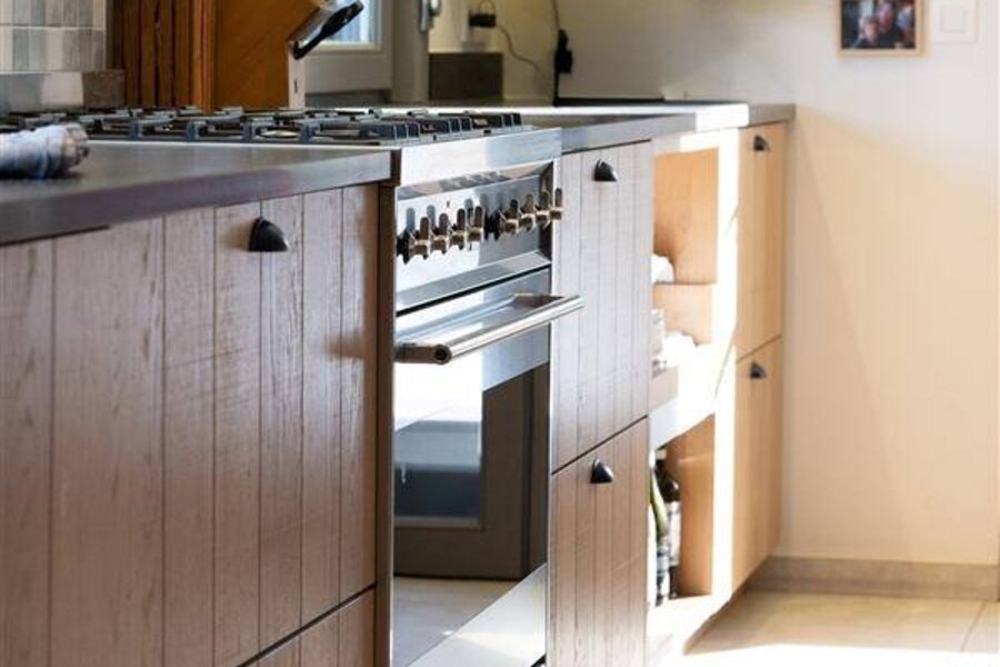 De op maat gemaakte keuken (2019) met directe toegang tot de aangelegde tuin, is uitgerust met kwalitatieve toestellen en hoogwaardige afwerking.