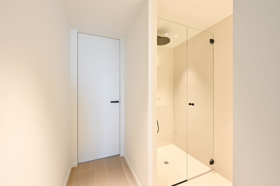 Mogelijkheid tot aankoop van een ruime garagebox met laadpaal. High-End afwerking met vloerverwarming/koeling met geothermie, alarm, domotica, enz..