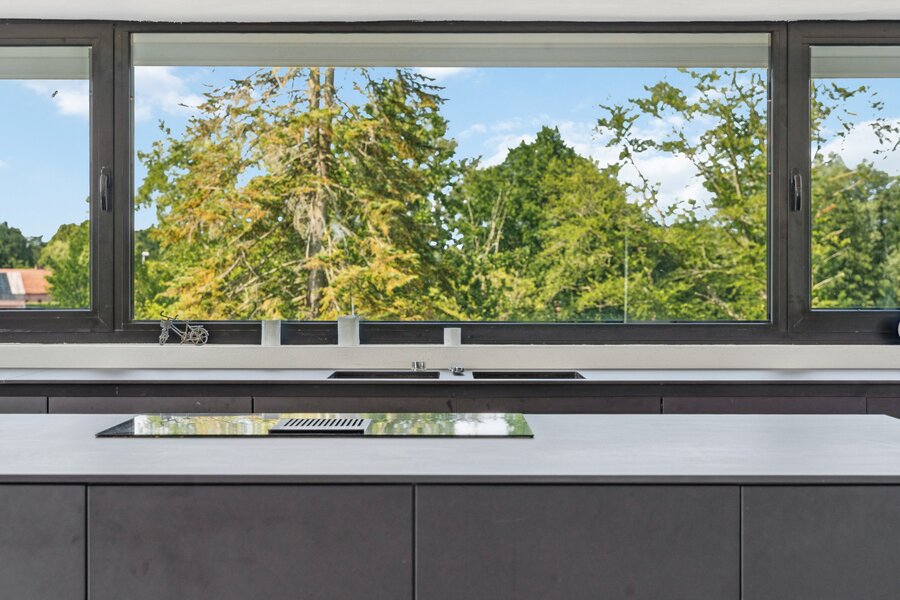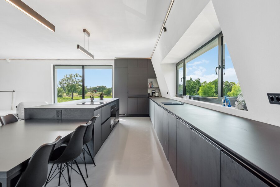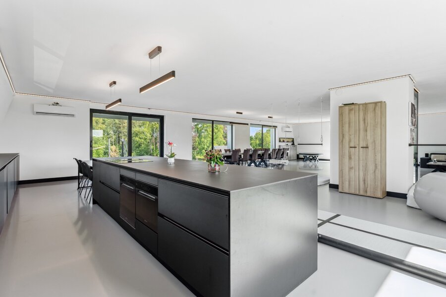 De ruime en lichtrijke leefruimte in loft-stijl en de open keuken met kookeiland vormen het hart van de woning, ideaal voor familie en gasten.