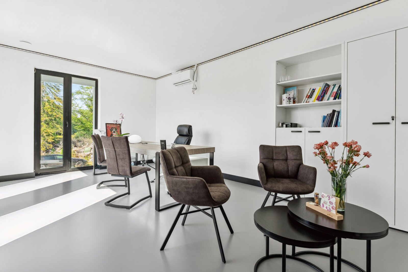 Bij binnenkomst in de inkomhal wordt u verwelkomd door het open zicht op de tuin. Vooraan de woning treffen we het zeer ruime en lichte kantoor met prachtig zicht op de omgeving. De master suite met badkamer en dressing biedt het comfort van slapen op het gelijkvloers. De wellnessruimte met sauna, meerdere jacuzzi 's en ontspanningsruimte maakt van thuis komen een dagelijks vakantiegevoel. Verder is er een praktische wasplaats en een apart gastentoilet.