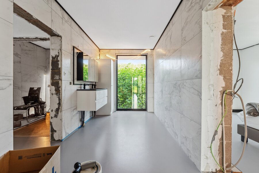 Na de aanleg buiten, het plaatsen van een buitentrap en binnendeuren zal deze woning zo goed als afgewerkt zijn.