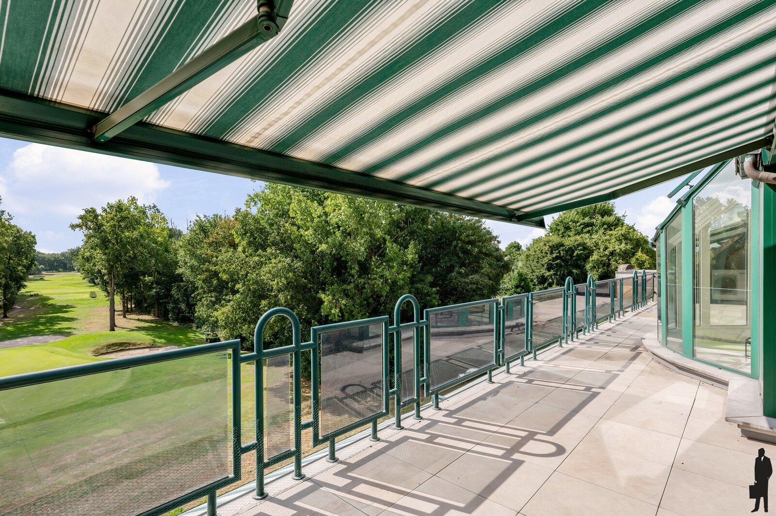 Breed terras met panoramisch uitzicht over golf en groen, voorzien van elektrische zonneweringen en buitenberging
