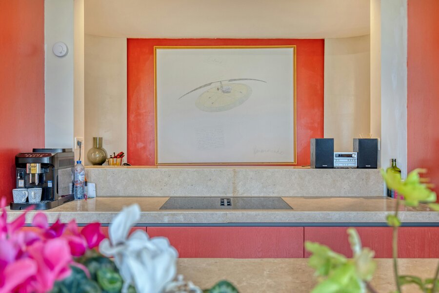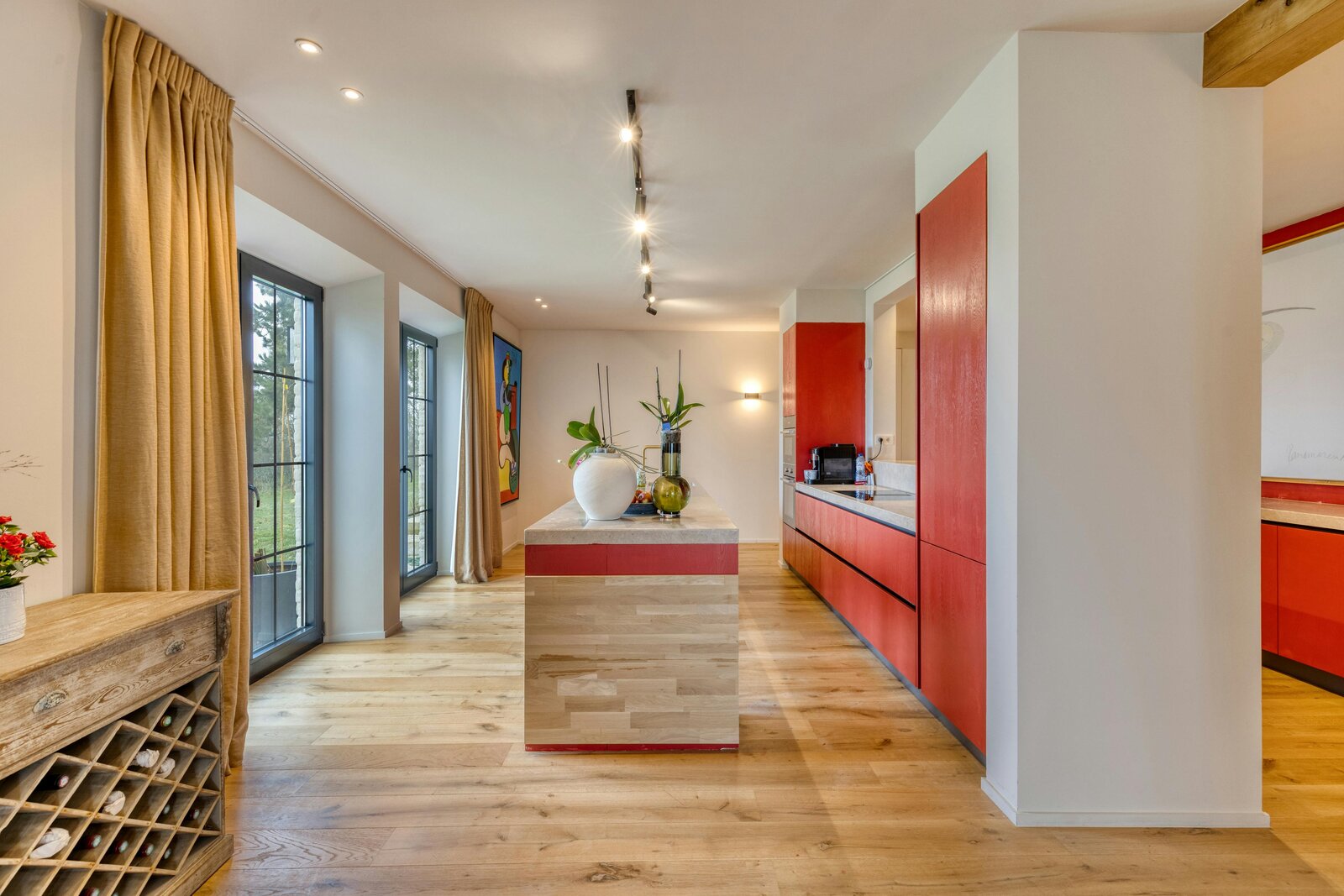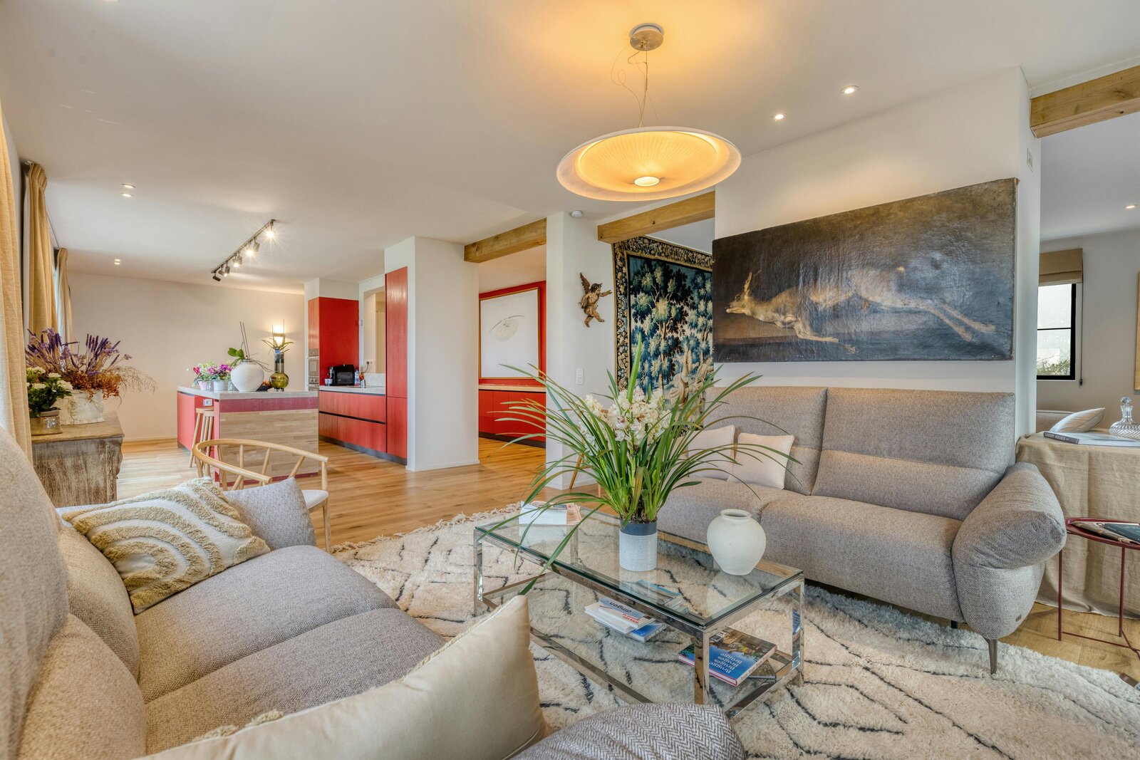 - leefruimte, ingedeeld in eet- en zitplaats gescheiden door de houthaard, met open geïnstalleerde keuken