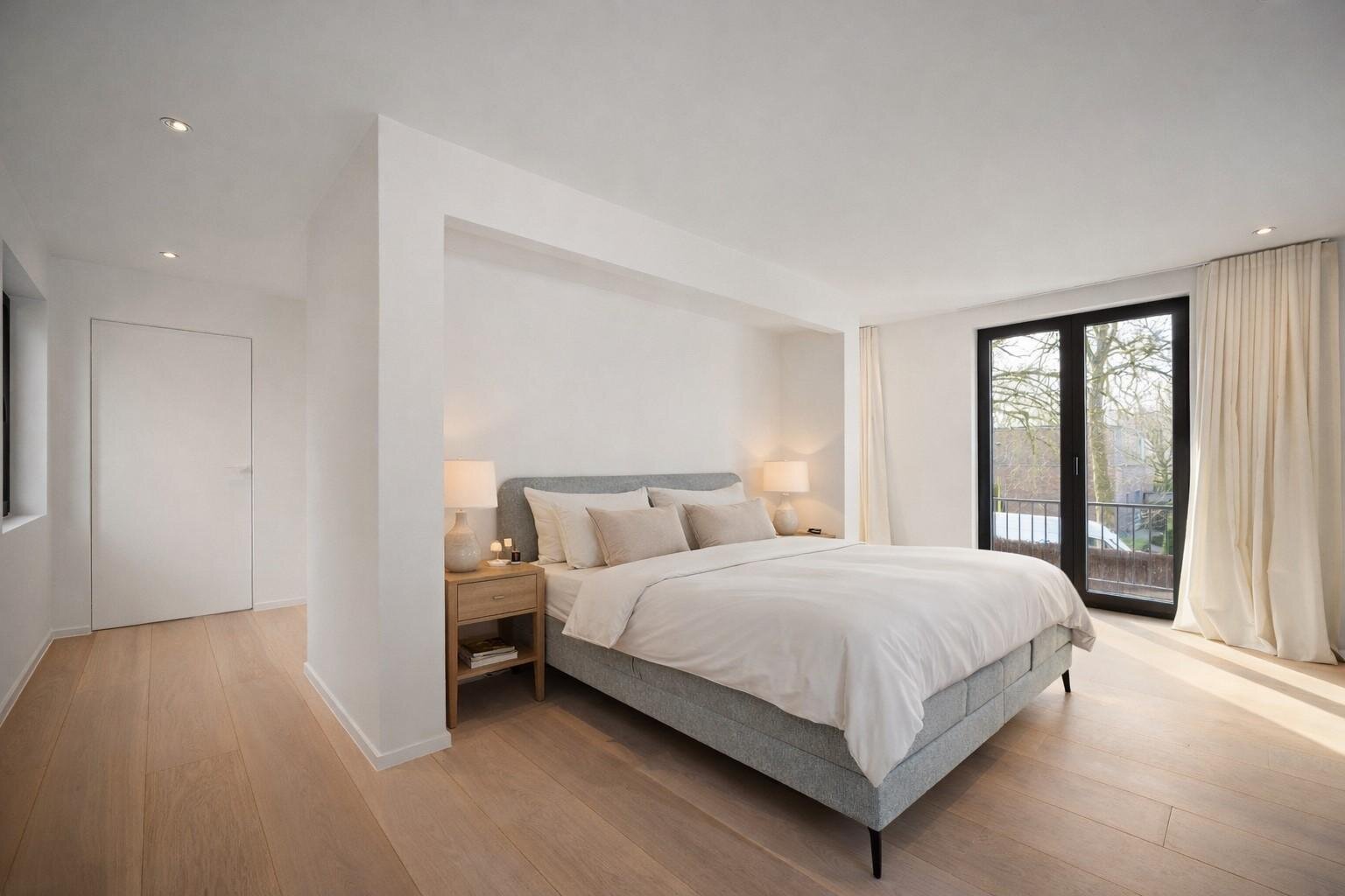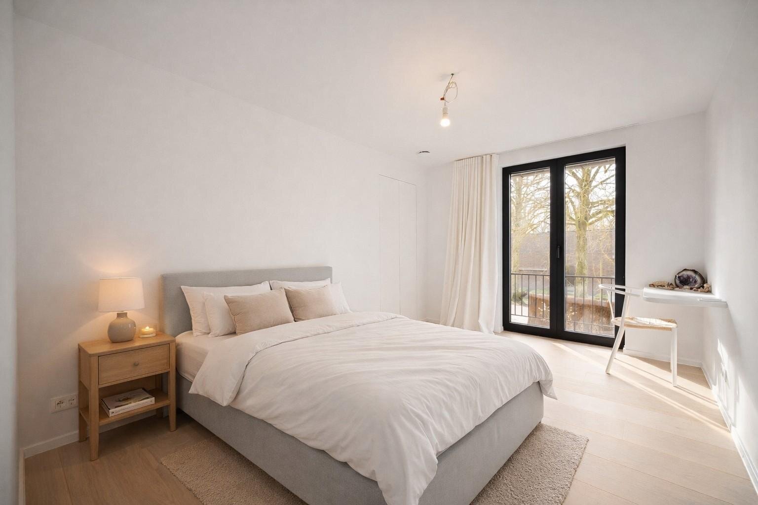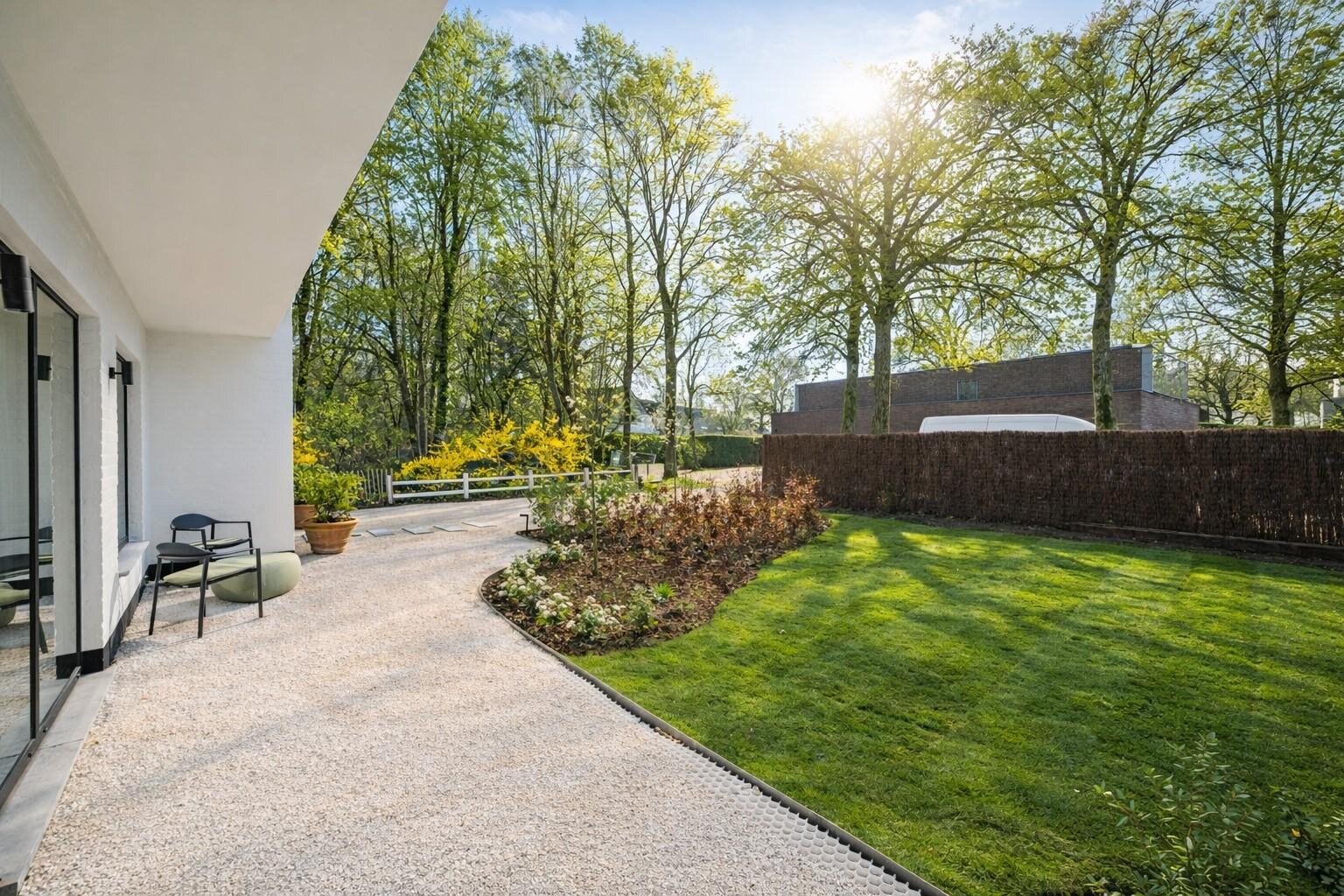 Buiten ligt een recent aangelegde, zonnige tuin met zwembad, waar het aangenaam vertoeven is doorheen de dag. De rustige ligging draagt bij aan het gevoel van privacy en comfort.
