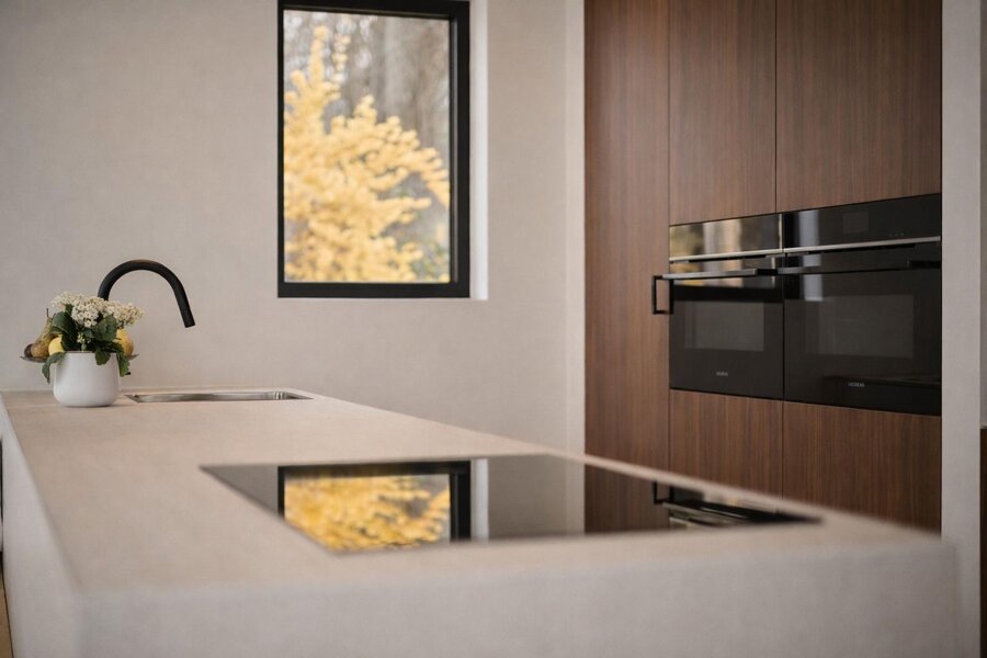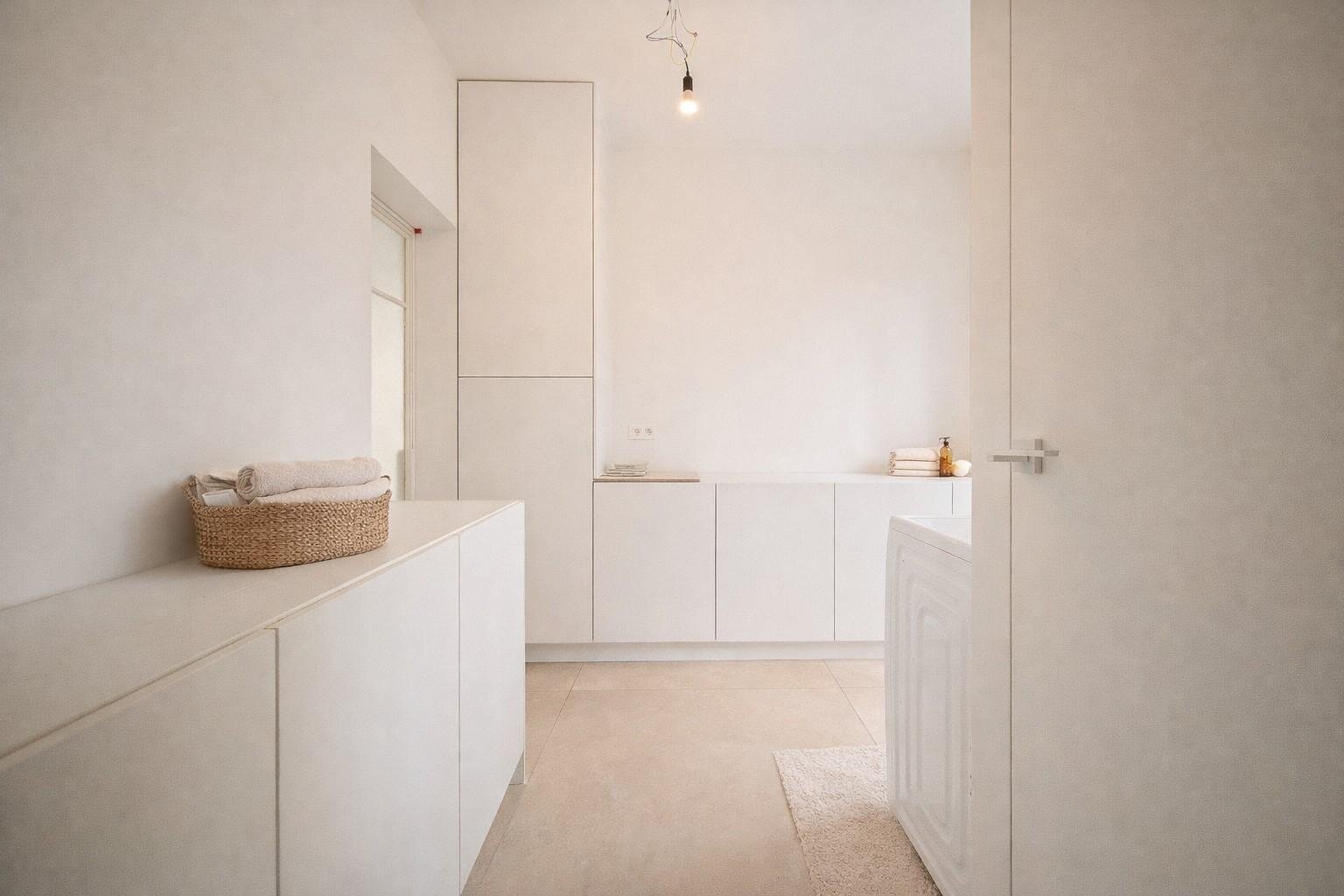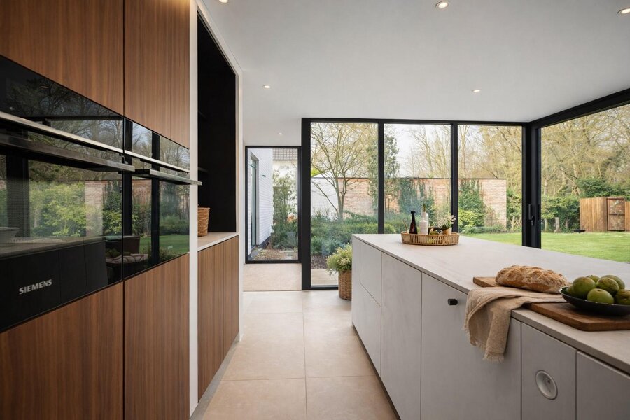 Aansluitend bevindt zich de volledig geïnstalleerde keuken met een bijkomende eetplaats, die mooi aansluit op de leefruimte. Dankzij de grote raampartijen geniet u hier van een prachtig, open zicht op de tuin en een overvloed aan natuurlijk licht. Verder is er een praktische wasberging met ingemaakte kasten.