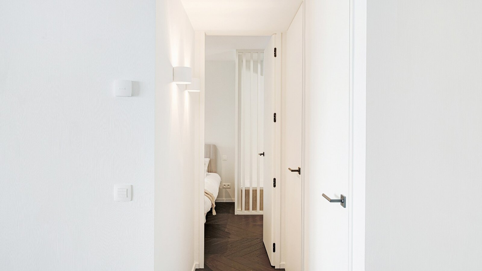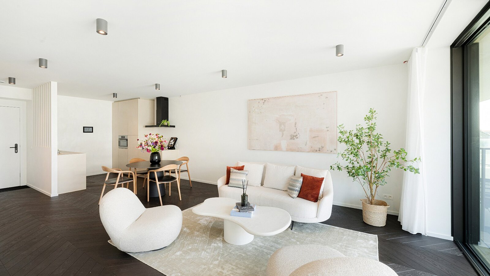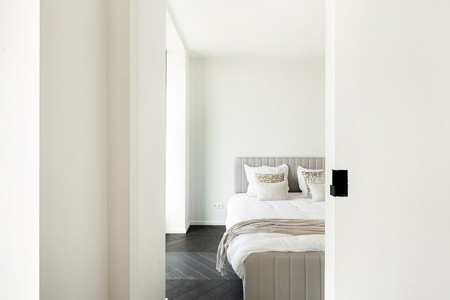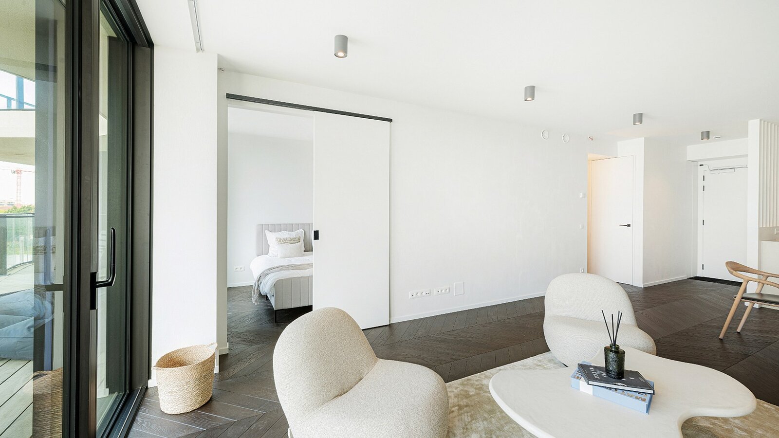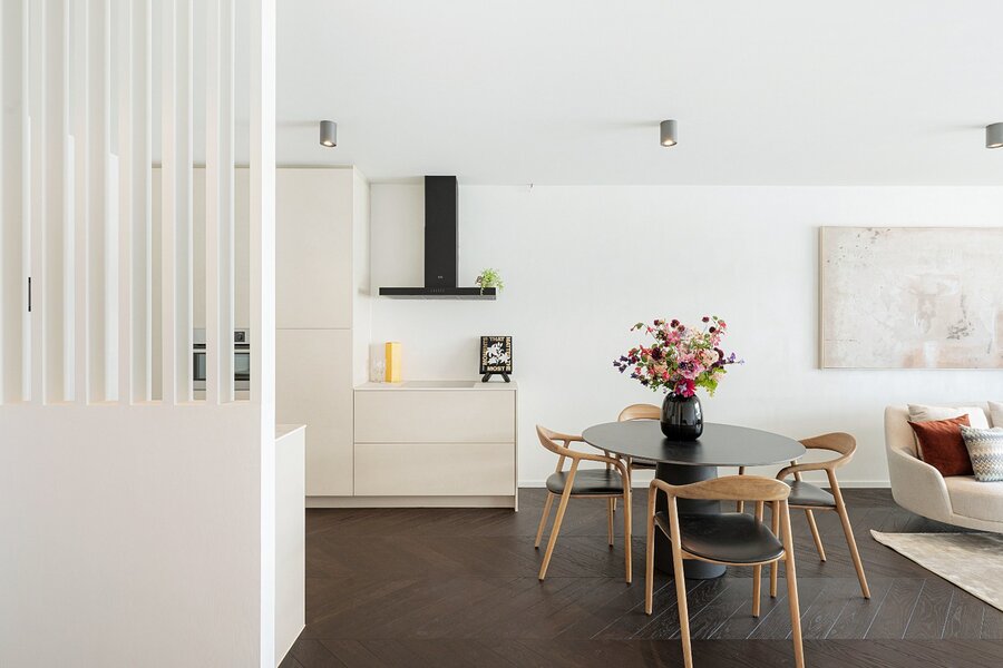 Zowel de leefruimte als de slaapkamers zijn afgewerkt met verfijnd visgraatparket, wat het geheel een warme en stijlvolle uitstraling geeft.