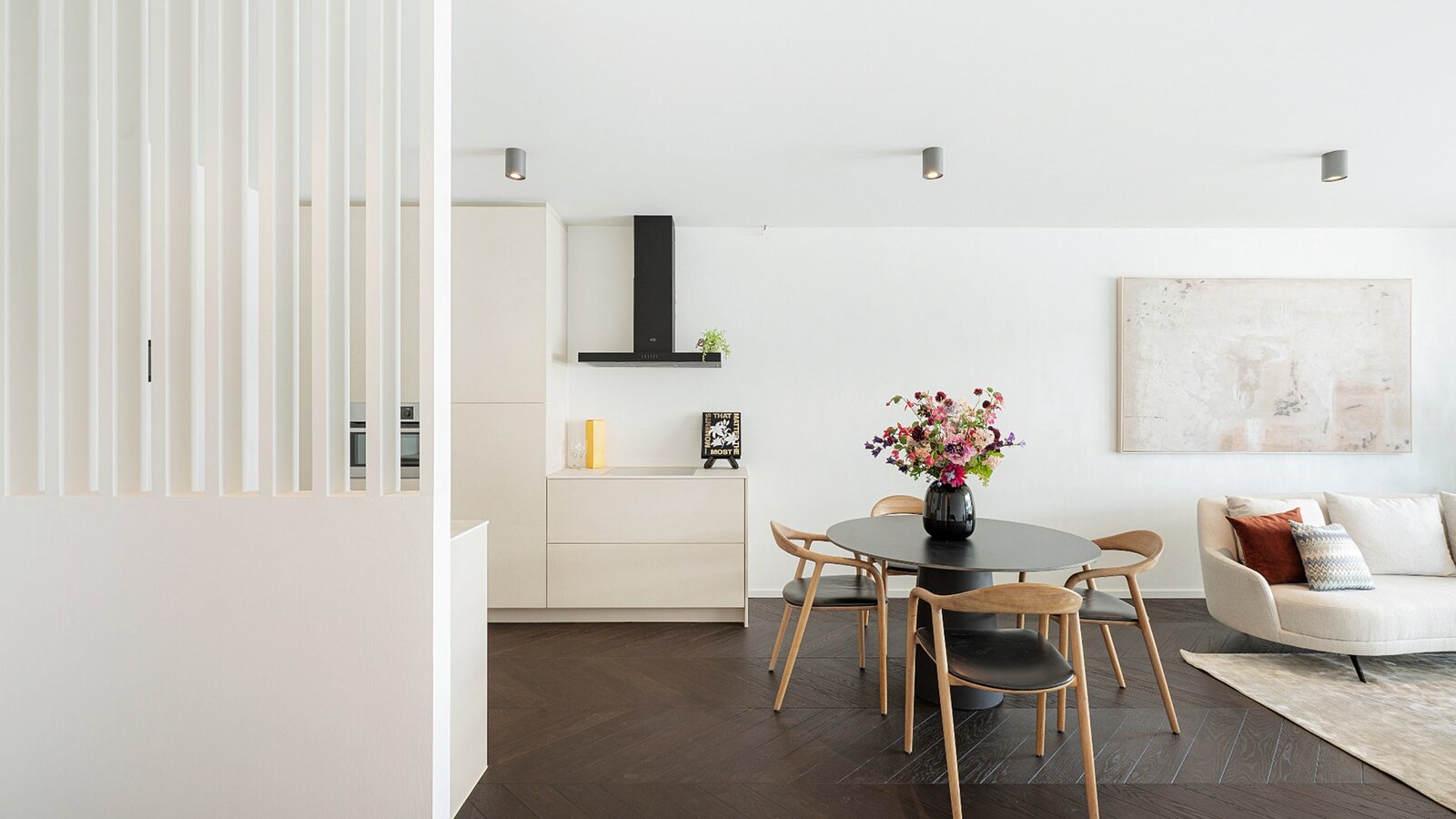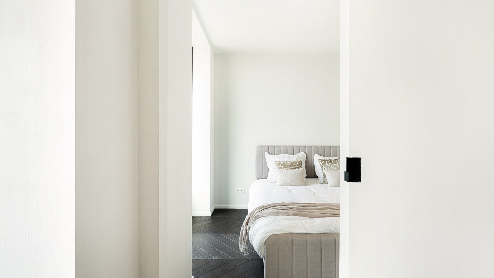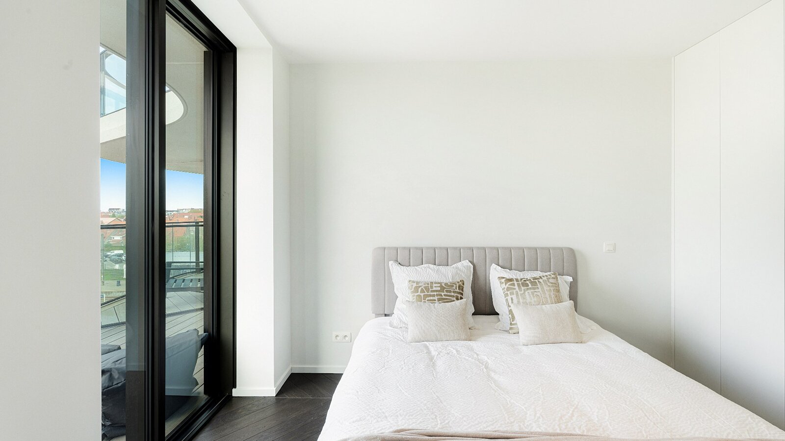 Zowel de leefruimte als de slaapkamers zijn afgewerkt met verfijnd visgraatparket, wat het geheel een warme en stijlvolle uitstraling geeft.