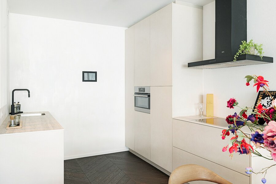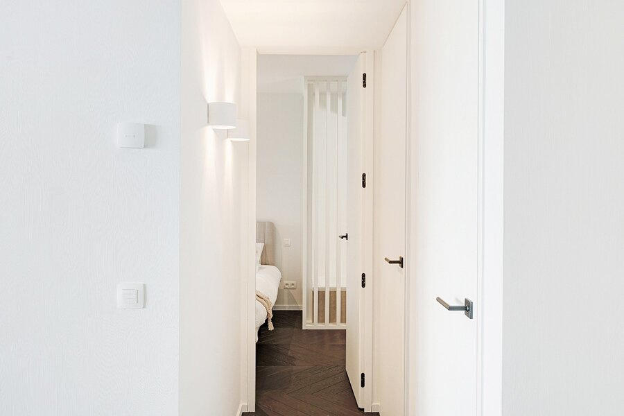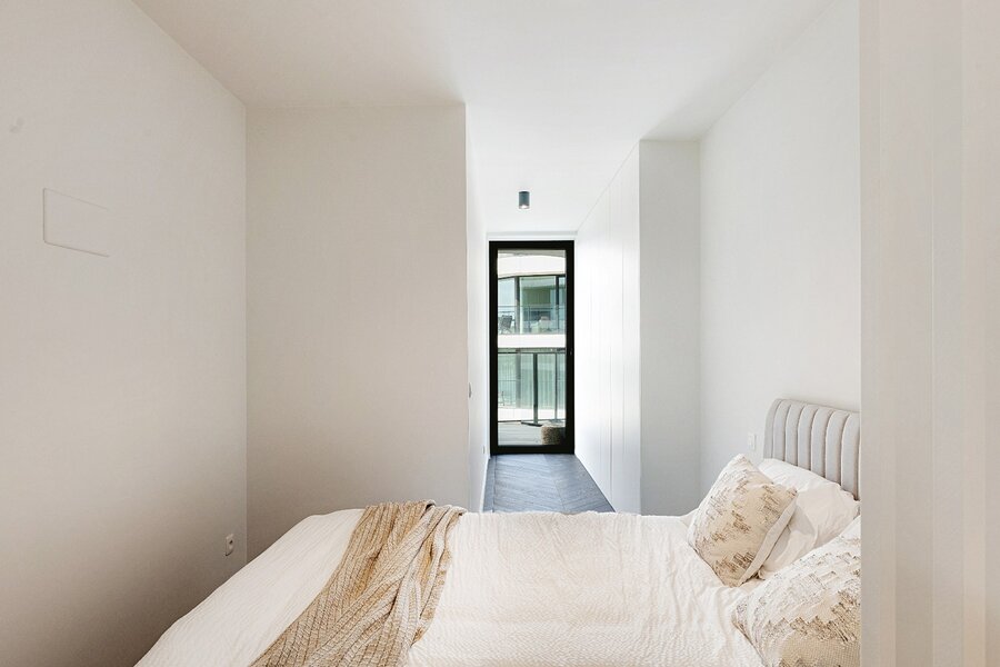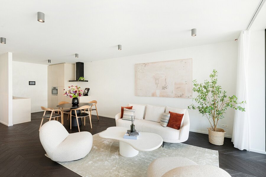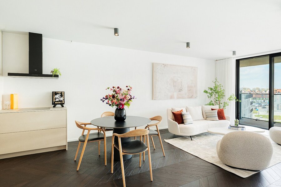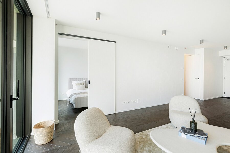 Het appartement beschikt over een lichtrijke woonkamer met een volledig uitgeruste open keuken. Zowel de leefruimte als de twee volwaardige slaapkamers geven directe toegang tot het terras, wat zorgt voor een aangename connectie tussen binnen en buiten.