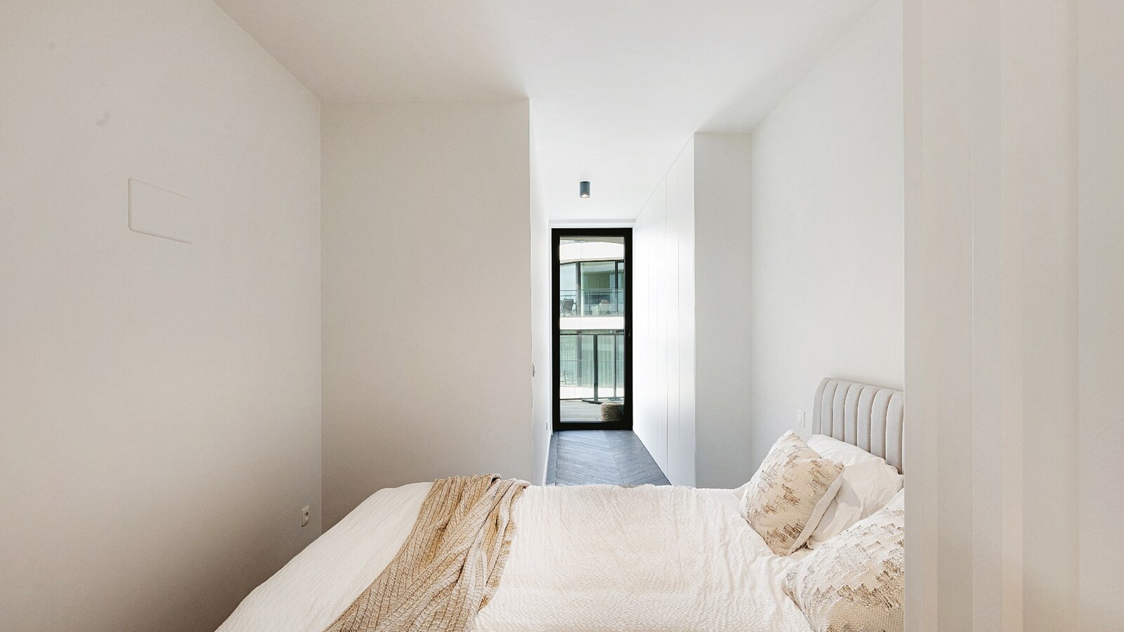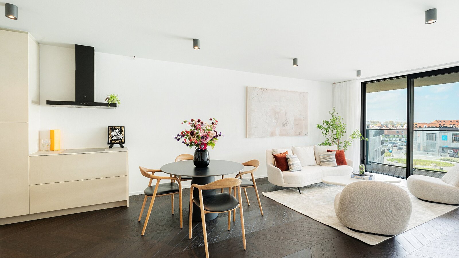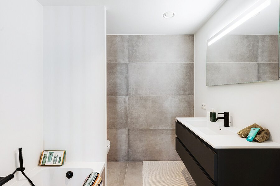 Het appartement beschikt over een lichtrijke woonkamer met een volledig uitgeruste open keuken. Zowel de leefruimte als de twee volwaardige slaapkamers geven directe toegang tot het terras, wat zorgt voor een aangename connectie tussen binnen en buiten.