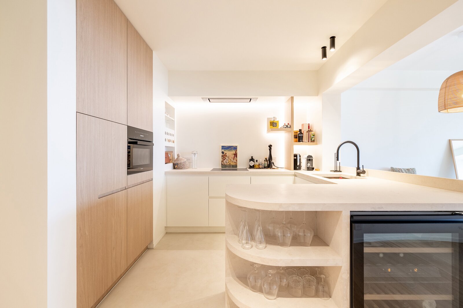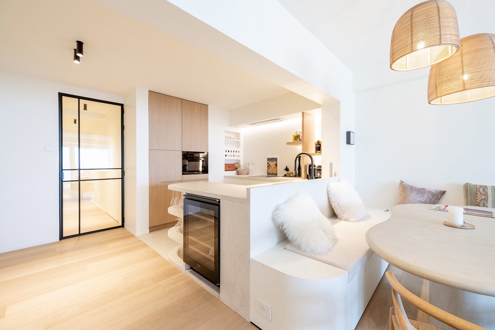 Indeling: ruime inkomhal met vestiaire en gastentoilet. Lichtrijke en indrukwekkende leefruimte met eetgedeelte, gekenmerkt door grote raampartijen die een panoramisch zicht bieden op het strand en de zee. Volledig geïntegreerde open keuken.
