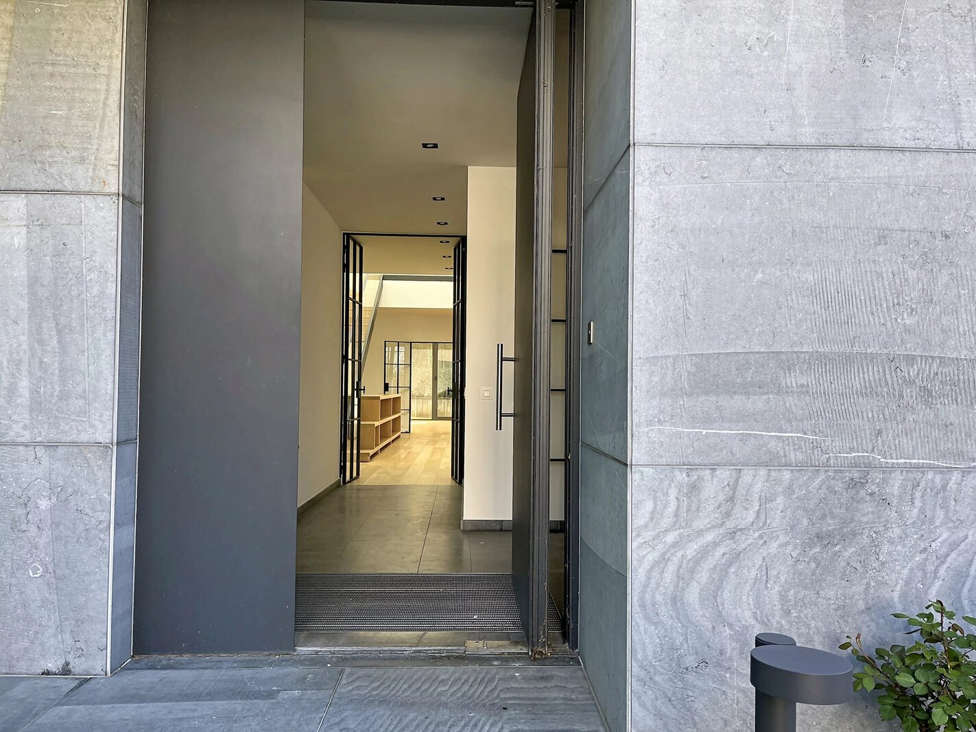 Op de begane grond komt men binnen in een eerste hal die een kleedkamer, een toilet en een wasbak voor gasten bedient. Vervolgens komt men in een tweede open hal die uitkomt op een ruime woonkamer met een volledig uitgeruste geïntegreerde keuken en een open uitzicht op het terras, de tuin en het zwembad, allemaal op het zuiden gericht. Twee kantoren maken de begane grond compleet.