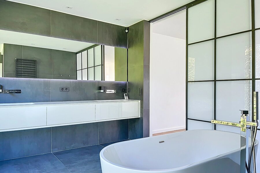 Op de bovenverdieping bevinden zich vier grote slaapkamers, allemaal met een aangrenzende badkamer. De hoofdslaapkamer met de enorme garderobe en badkamer is bijzonder indrukwekkend.