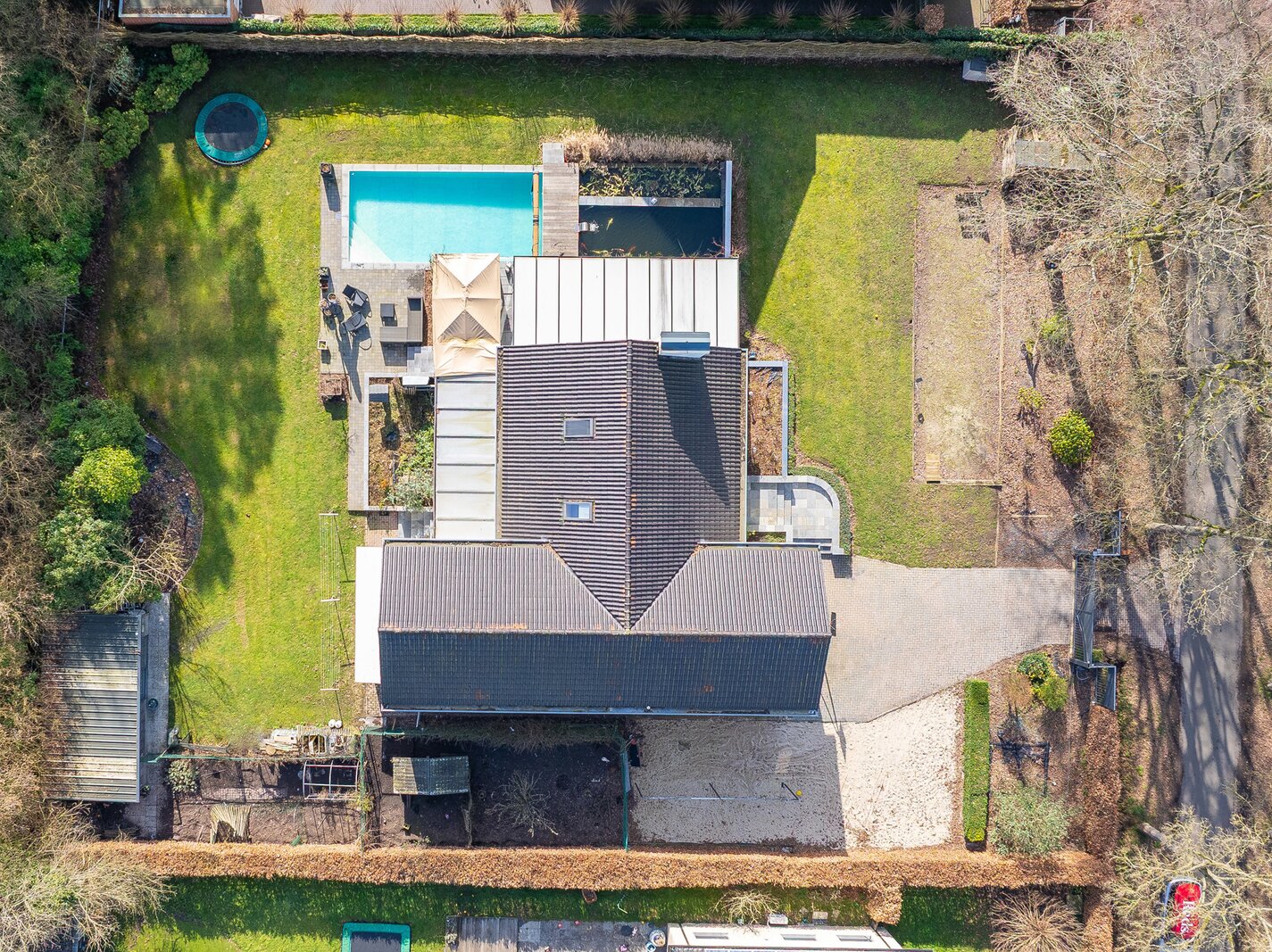 Ook buiten is het puur genieten: een zonnige tuin met zwembad, veranda en ruim terras vormt het perfecte decor voor ontspanning, gezellige familiemomenten en lange zomeravonden.